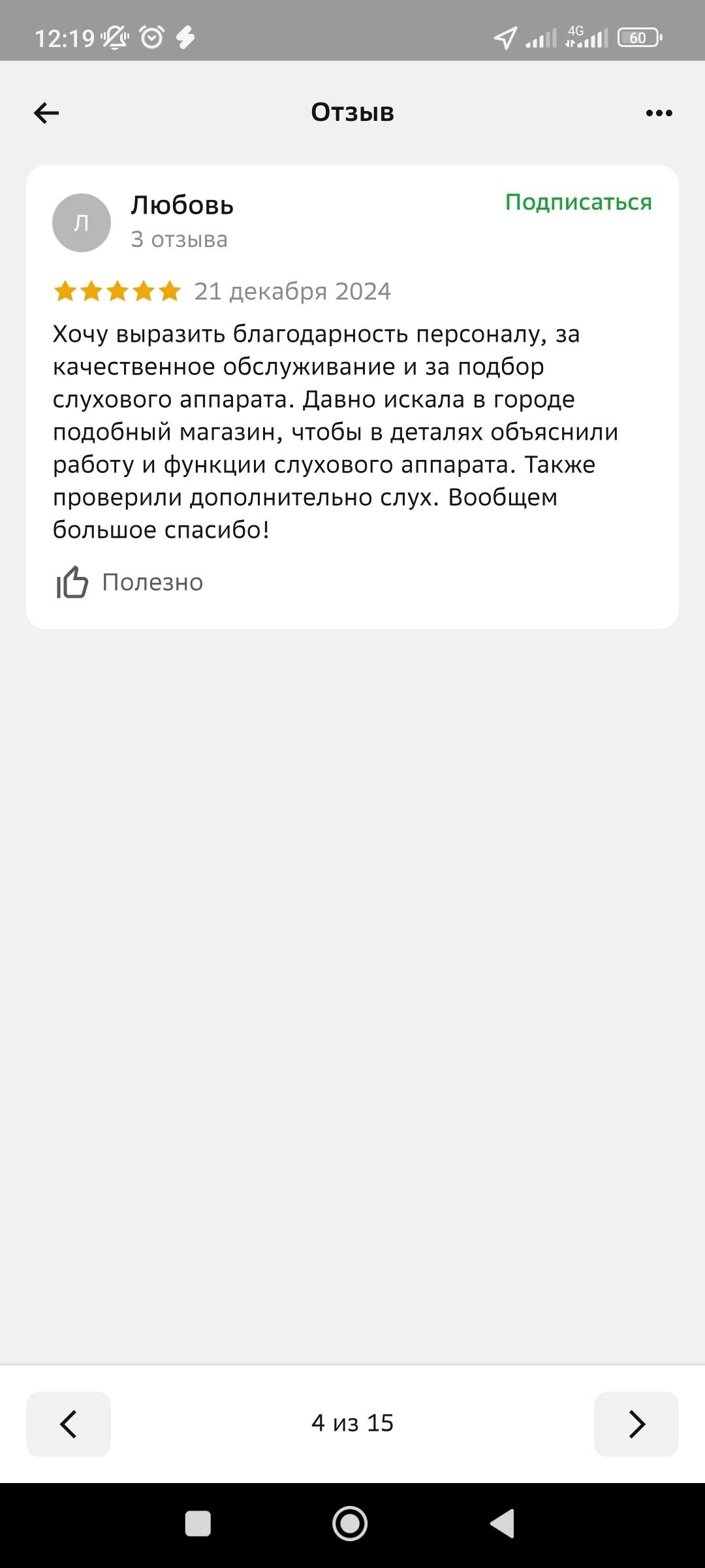 Хочу выразить благодарность персоналу, за качественное обслуживание и за подбор слухового аппарата. Давно искала в городе подобный магазин, чтобы в деталях объяснили работу и функции слухового аппарата. Также проверили дополнительно слух. Вообщем большое спасибо!