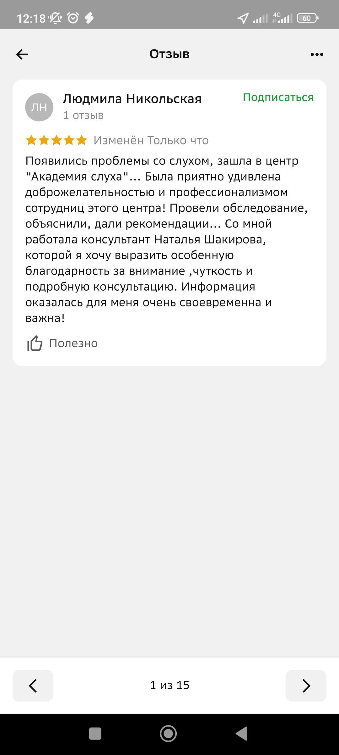 Появились проблемы со слухом, зашла в центр "Академия Слуха" ... Была приятно удивлена доброжелательностью и профессионализмом сотрудниц этого центра! Провели обследование, объяснили, дали рекомендации... Со мной работала Наталья Шакирова, которой я хочу выразить особенную благодарность за внимание, чуткость и подробную консультацию. Информация оказалась для меня очень своевременна и важна!