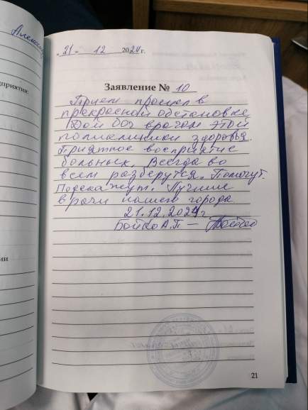 Прием прошел в прекрасной обстановке. Дай Бог врачам этой поликлиники здоровья. Приятное восприятие больных. Всегда во всем разберутся. Помогут. Подскажут. Лучшие врачи нашего города. 21.12.2024г. Бойко А.П.
