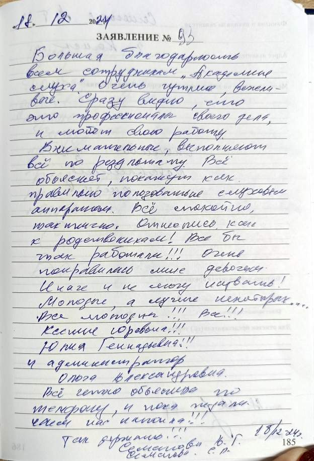 Большая благодарность всем сотрудникам "Академии слуха". Очень чуткие, вежливые. Сразу видно, что это профессионалы своего дела, и любят свою работу.