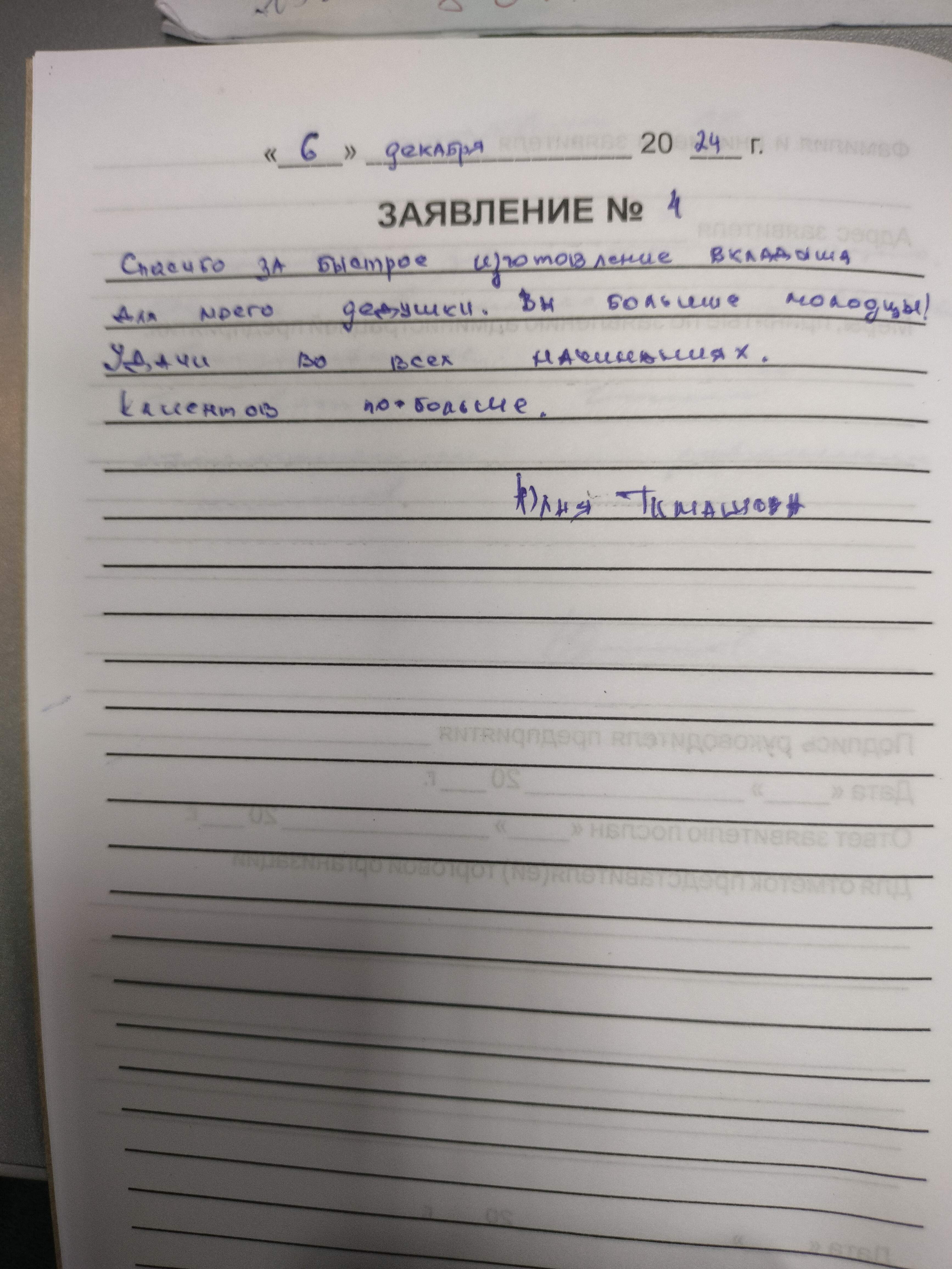 Спасибо за быстрое изготовление вкладыша для моего дедушки. Вы большие молодцы! Удачи во всех начинаниях. Клиентов побольше.