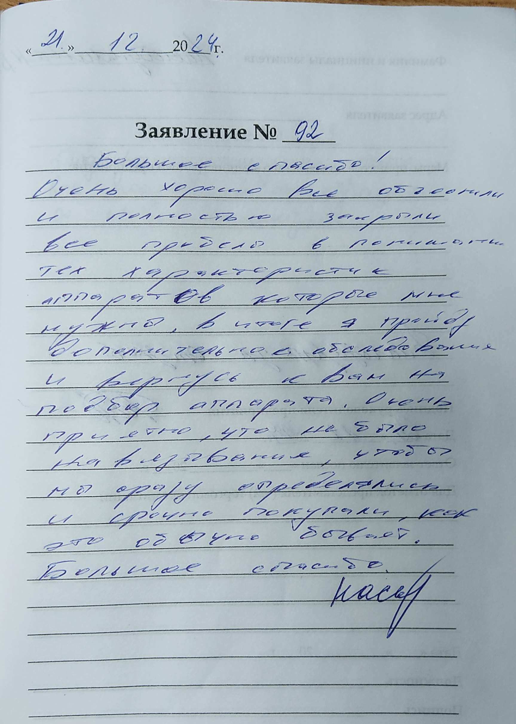 Очень хорошо все объяснили и полностью закрыли все пробелы в понимании технических характеристик аппаратов,которые мне нужны,в итоге я проду дополнительное бследование и вернусь к вам на подбор аппарата.Очень приятно,что не было навязывания,чтобы мы сразу определились и срочно покупали,как это обычно бывает.