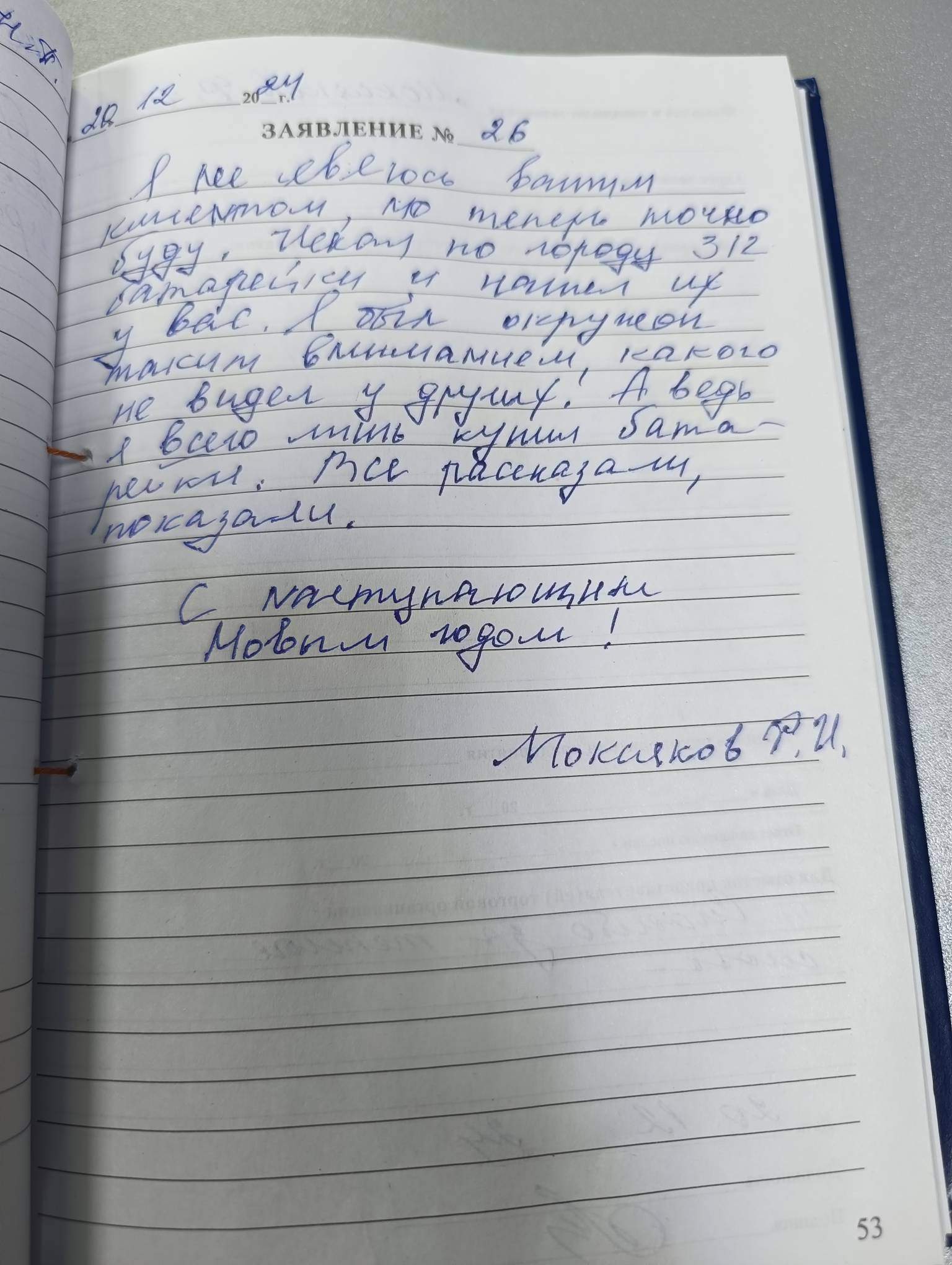 Я не являюсь вашим клиентом, но теперь точно буду. Искал по городу 312 батарейки и нашел их у вас.Я был окружен таким вниманием, какого не видел у других! А ведь я всего лишь купил батарейки. Все рассказали, показали. С наступающим Новым годом!
