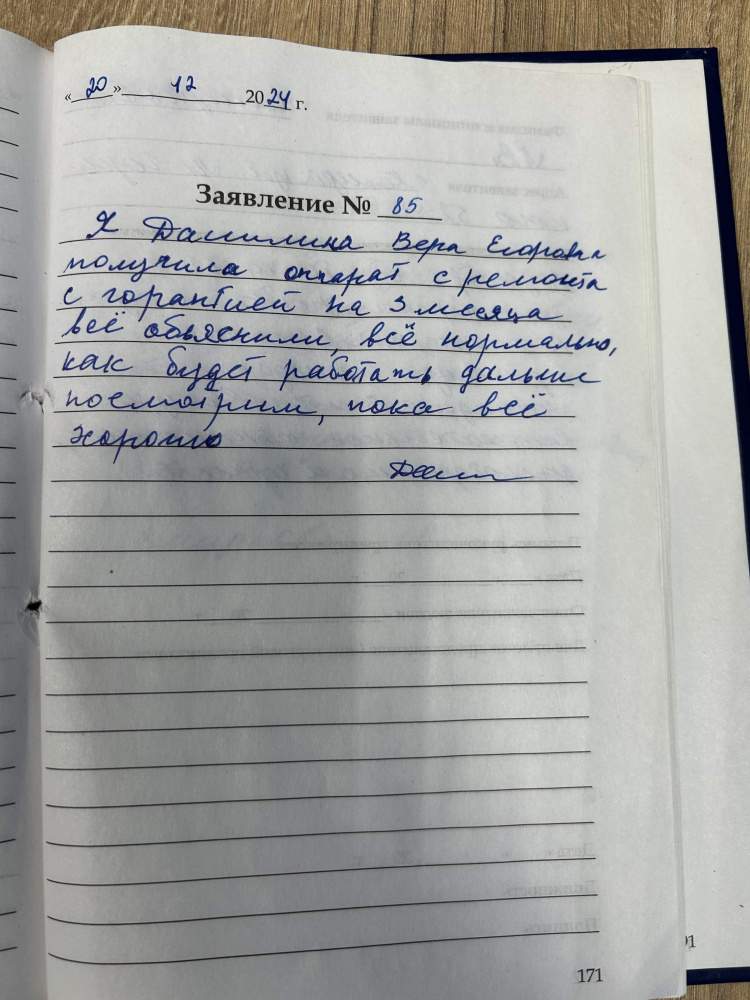 Я Дашина Вера Егоровна получила аппарат с ремонта с гарантией на 3 месяца всё объяснили, всё нормально, как будет работать дальше посмотрим, пока всё хорошо.