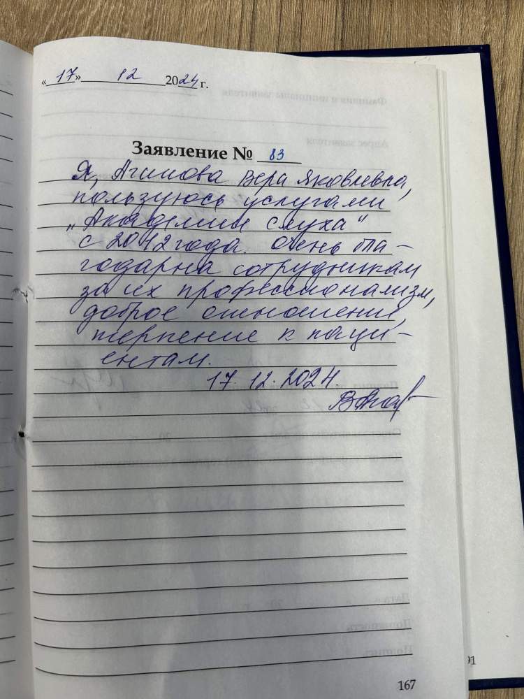 Я Агапова Вера Яковлевна пользуюсь услугами «Академии Слуха» с 2012 гола. Очень благодарна сотрудникам за их профессионализм, доброе отношение, терпение к пациентам. 17.12.2024 года.