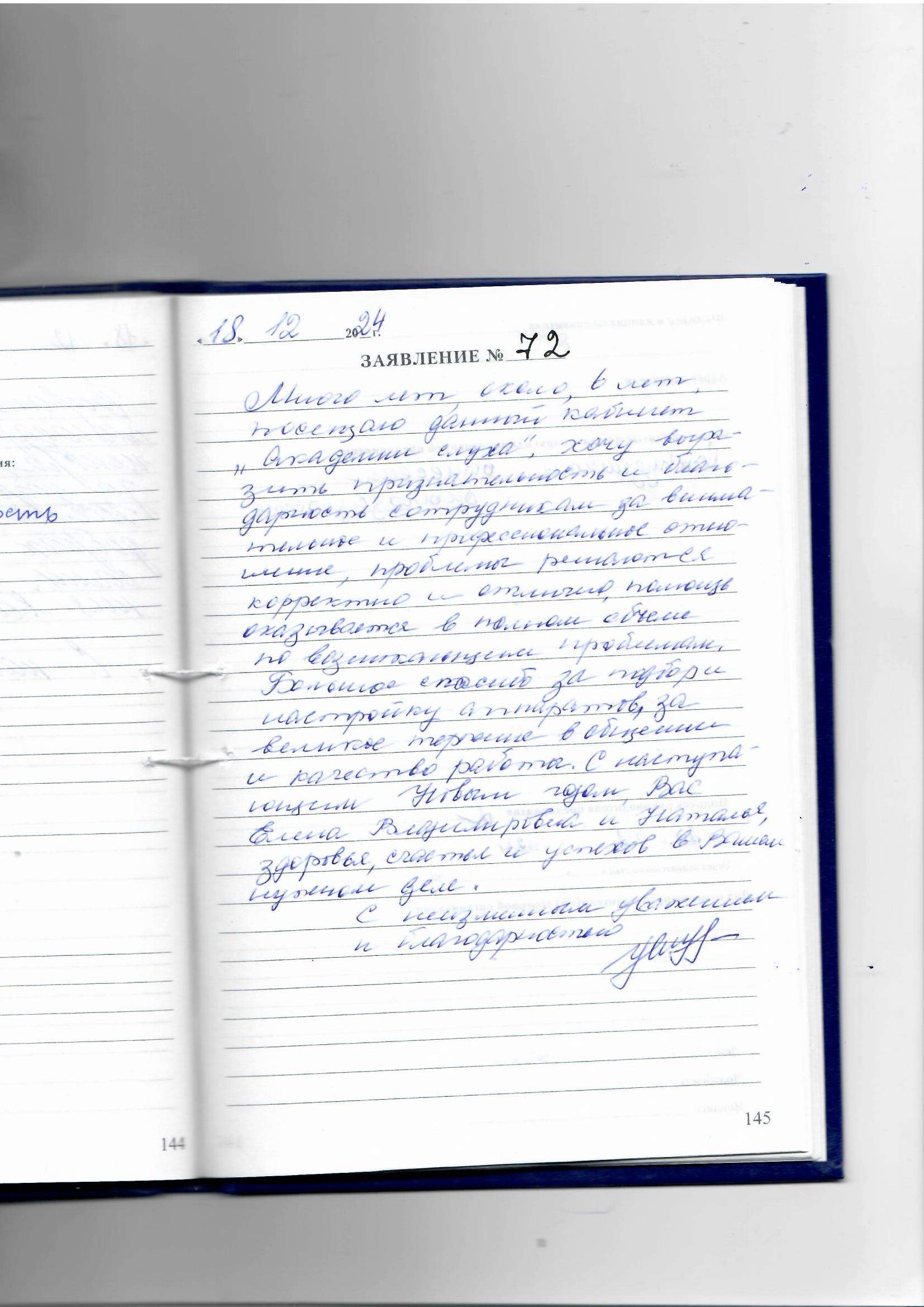 Много лет, около, 6 лет, посещаю данный кабинет "Академии слуха". хочу выразить признательность и благодарность сотрудникам за внимательное и профессиональное отношение, проблемы решаются корректно и отлично, помощь оказывается в полном объеме по возникающим проблемам. Большое спасибо за подбор и настройку аппаратов, за великое терпение в общении и качество работы. С наступающим Новым годом, Вас Елена Владимировна и Наталья, здоровья, счастья и успехов в Вашем нужном деле.