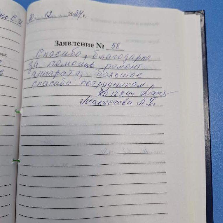 Спасибо! Благодарна за помощь, ремонт аппарата, большое спасибо сотрудникам. 20.12.2-24г. Макеечева Л.П.