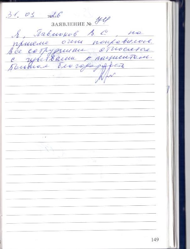 Я, Павлюков В.С., на приеме очень понравилось. Все сотрудники относятся с чувствами к пациентам. Большая благодарность.