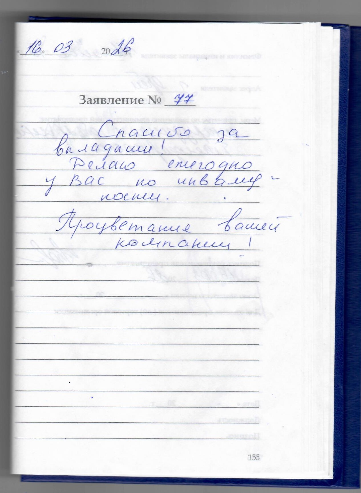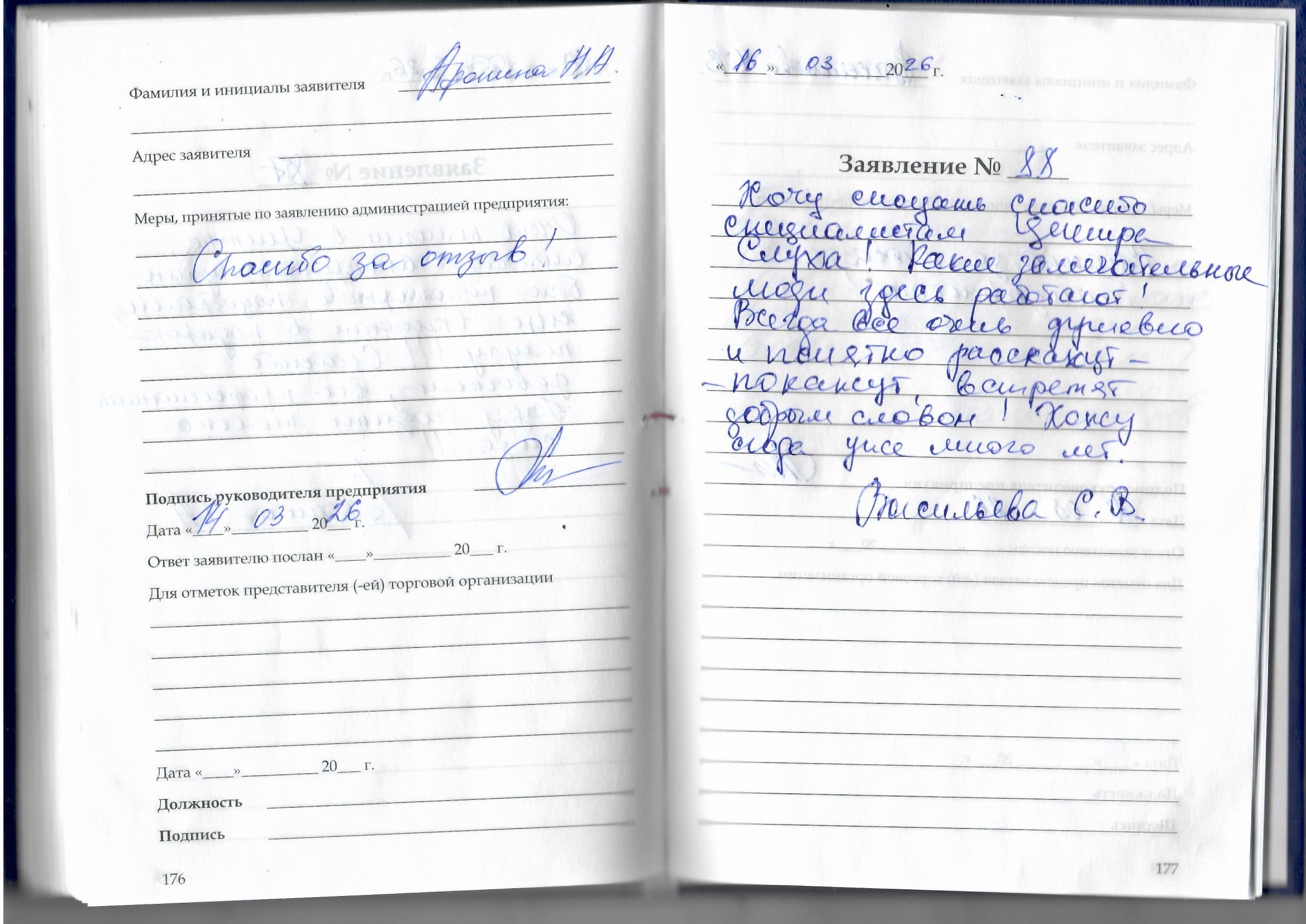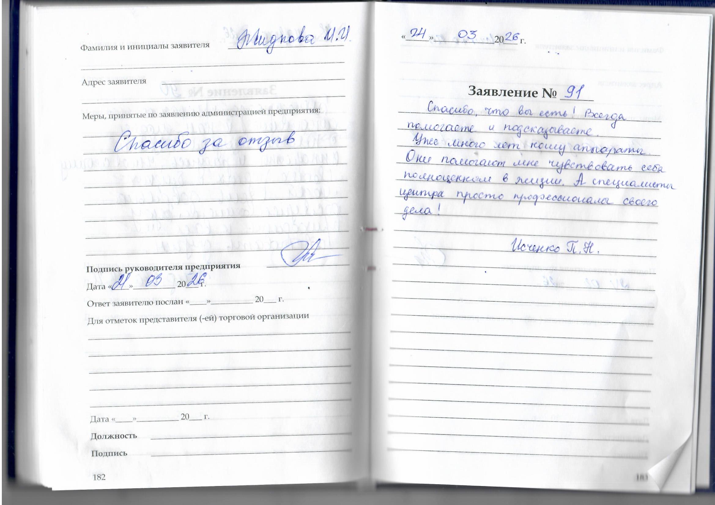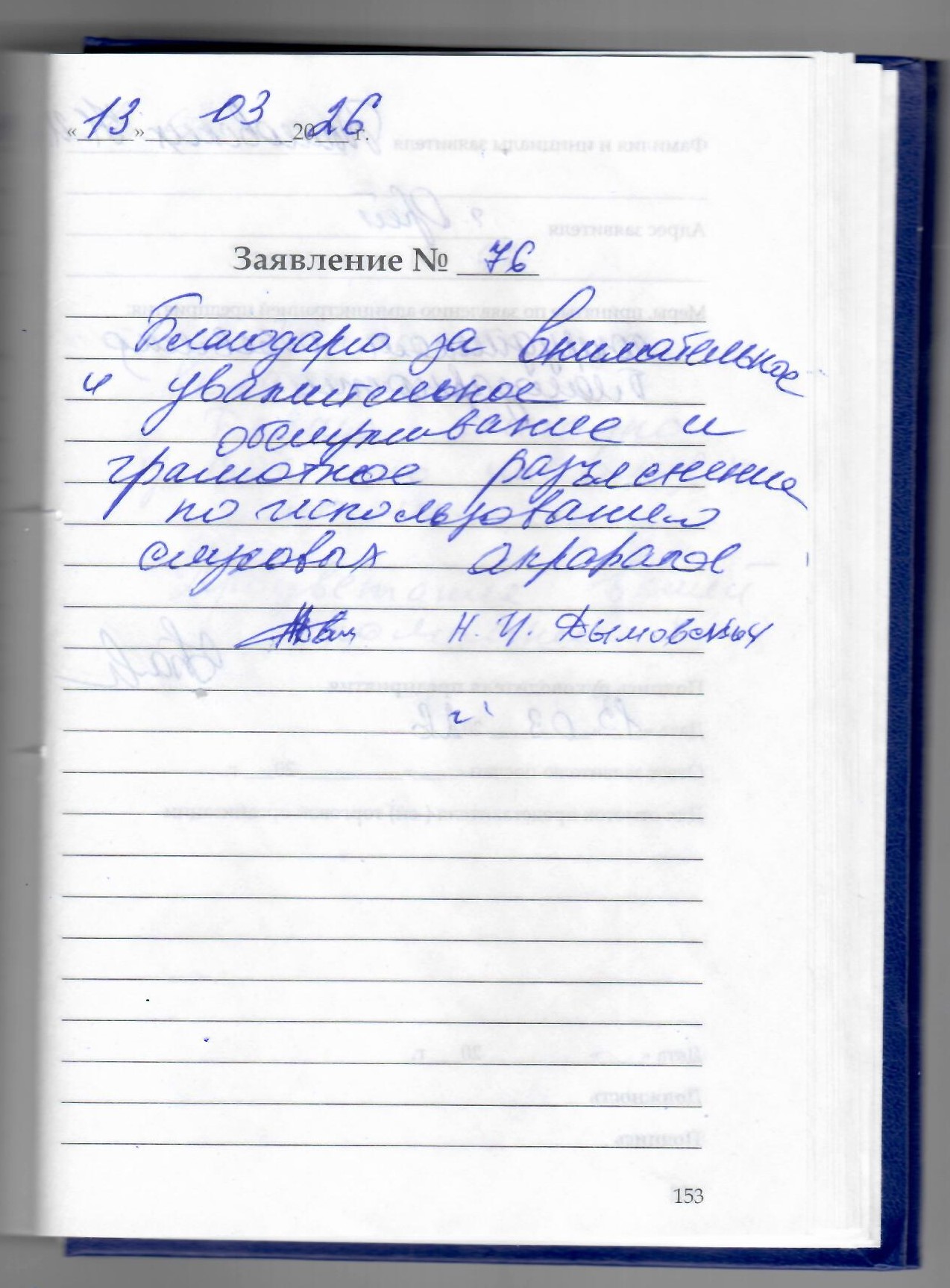 Спасибо за хорошее обслуживание в устройстве аппарата. Очень благодарна работникам. Удачи вам!