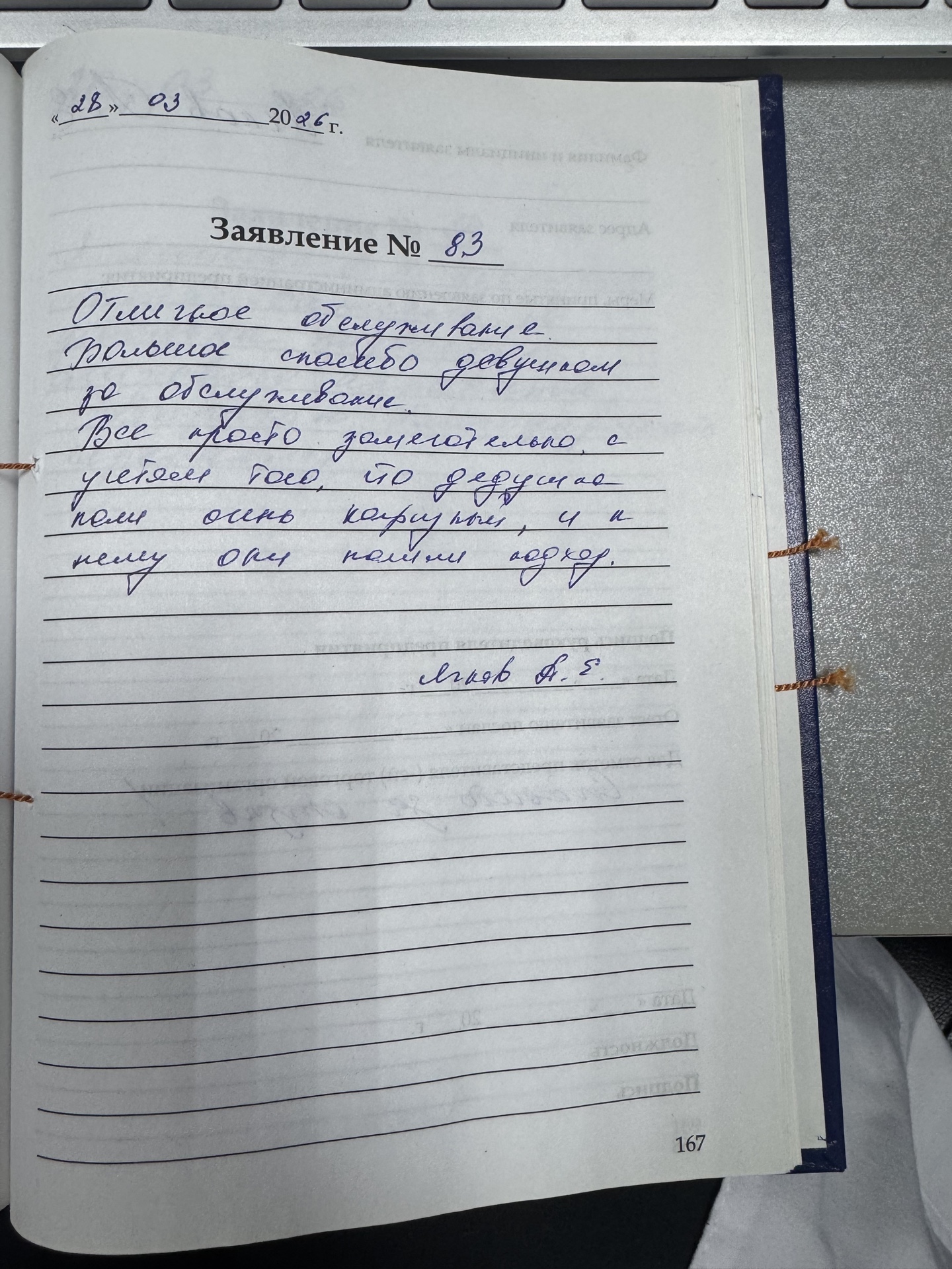 отличное обслуживание. большое спасибо девушкам за обслуживание. все просто замечательно, с учетом того, что дедушка мой очень капризный, и к нему они нашли подход.