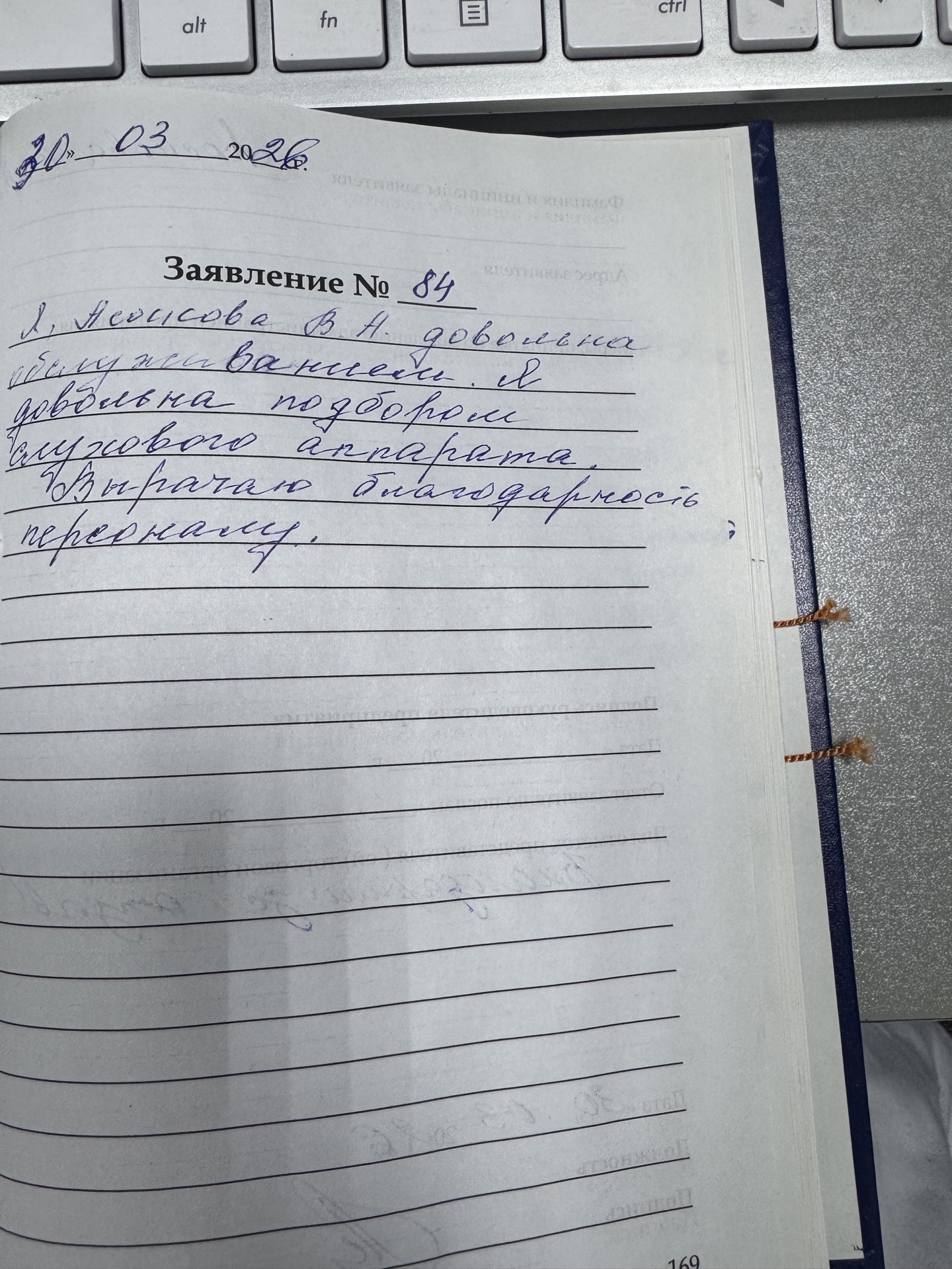 я, Асоскова В.А. довольна обслуживанием. Я довольна подбором слухового аппарата. Выражаю благодарность персоналу.