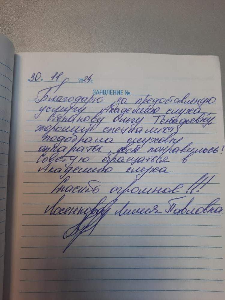 Благодарю за предоставленную услугу Академию слуха, Степанову Ольгу Геннадьевну, хороший специалист, подобрала слуховые аппараты, всё понравилось! Советую обращаться в Академию слуха. Спасибо огромное!!! Лосенкова Лилия Павловна.
