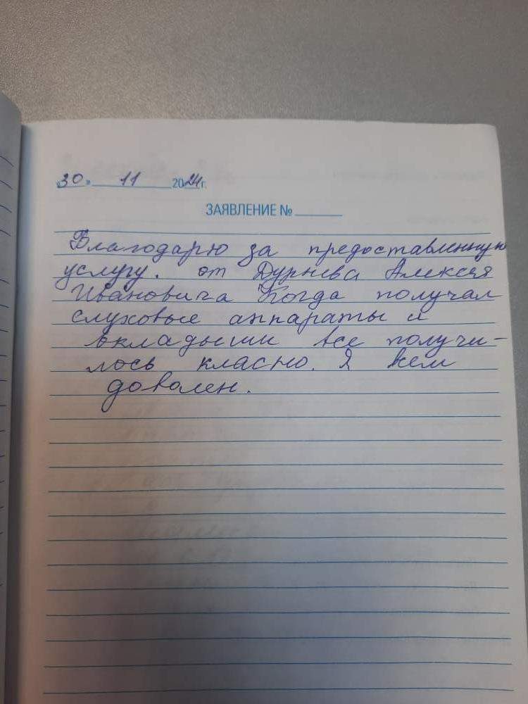 Благодарю за предоставленную услугу от Дурнева Алексея Ивановича. Когда получал слуховые аппараты и вкладыши, всё получилось классно. Я всем доволен.