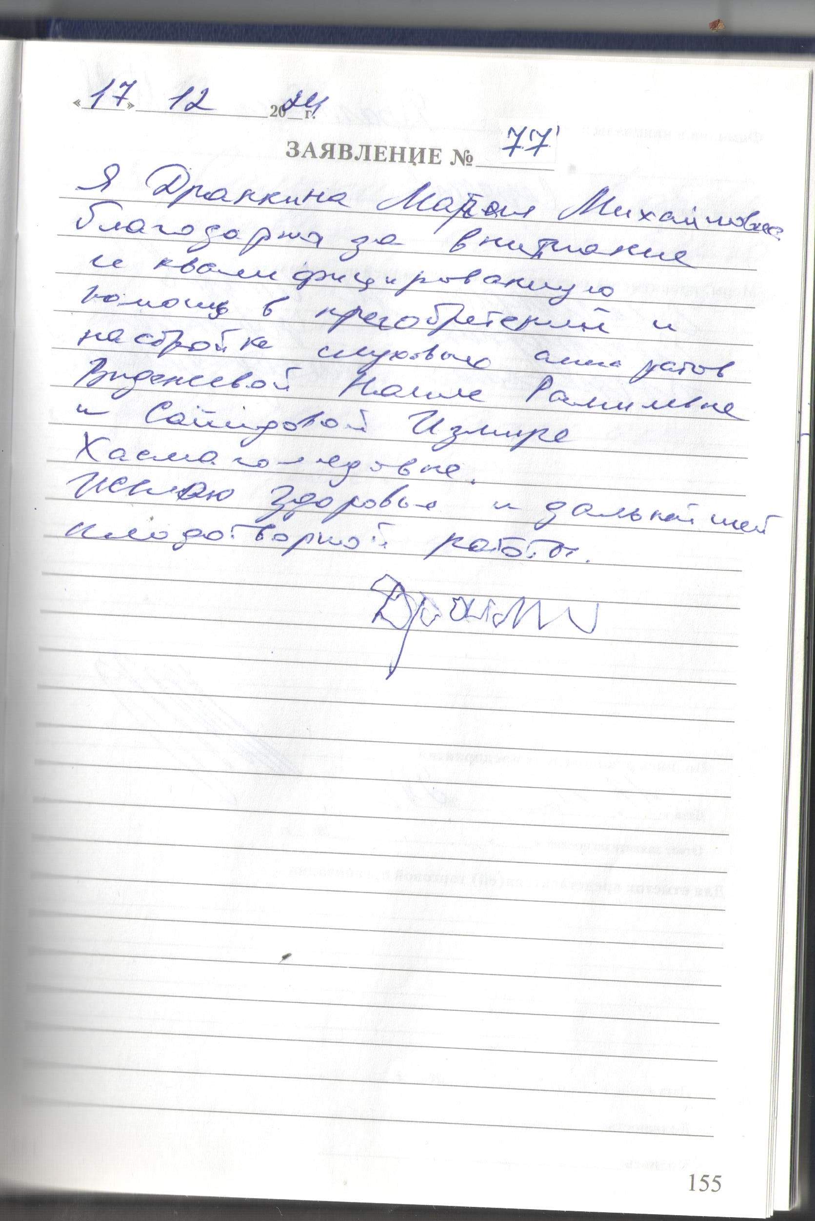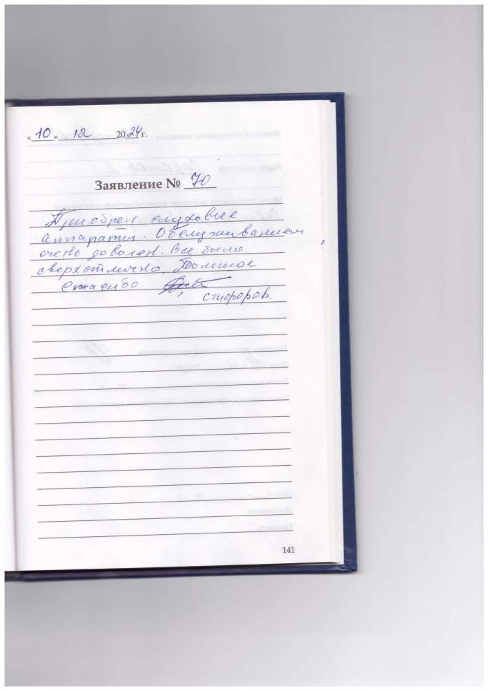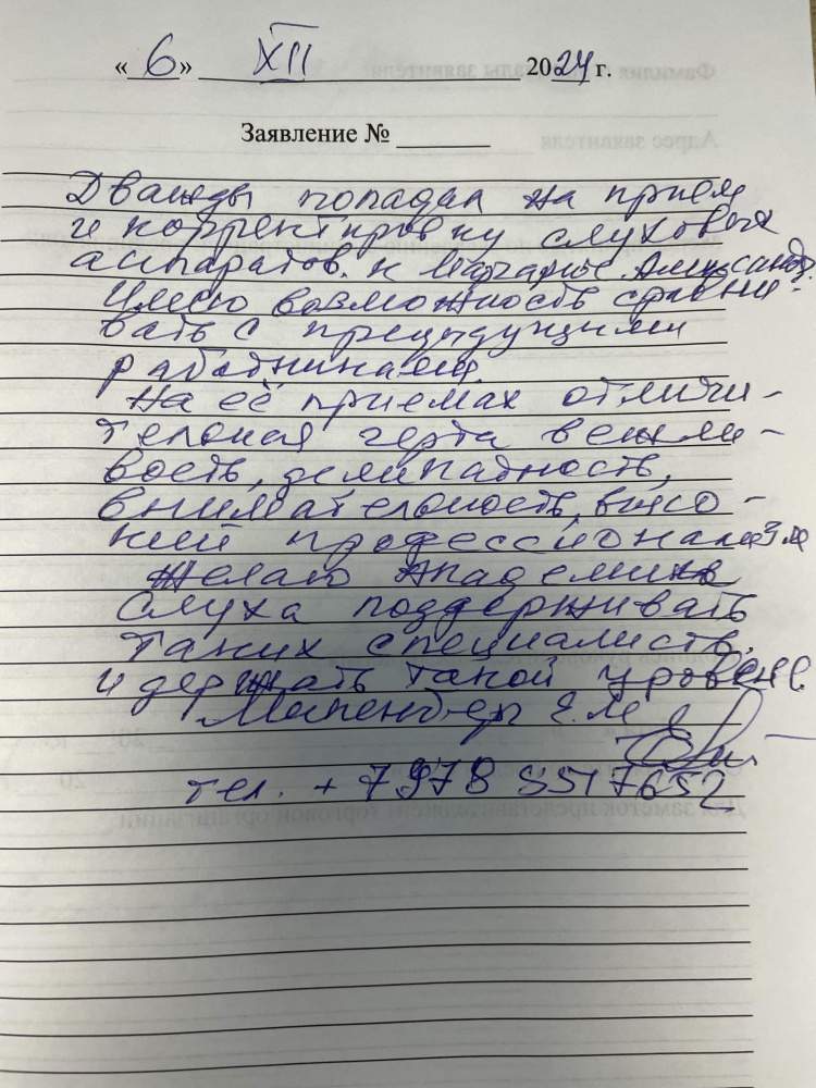 Я, Драпкина Мария Михайловна, благодарна за внимание и квалифицированную помощь в приобретении и настройке слуховых аппаратов Виденеевой Наиле Рамилевне и Сайидовой Измире Хасмагомедовне. Желаю здоровья и дальнейшей плодотворной работы