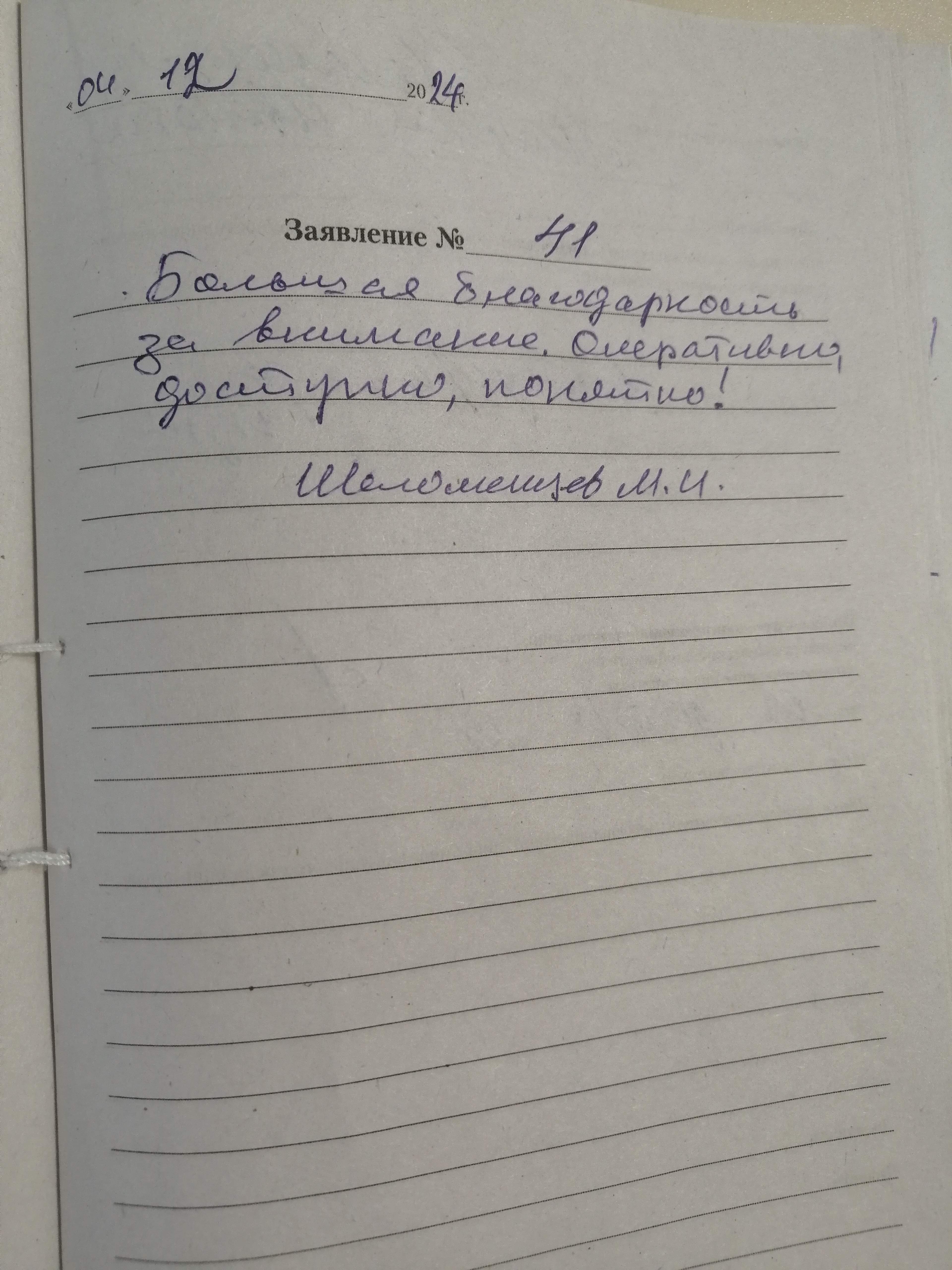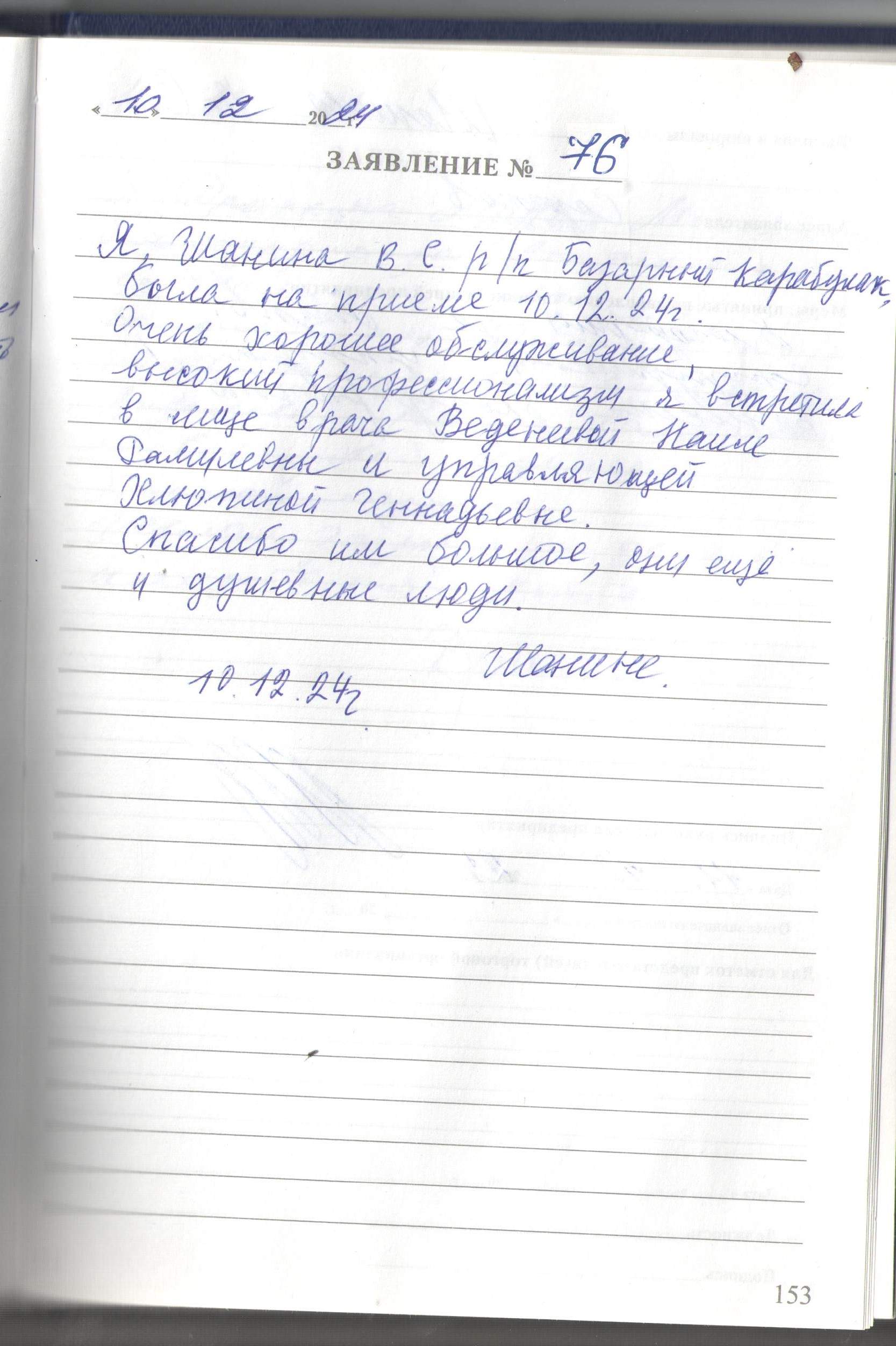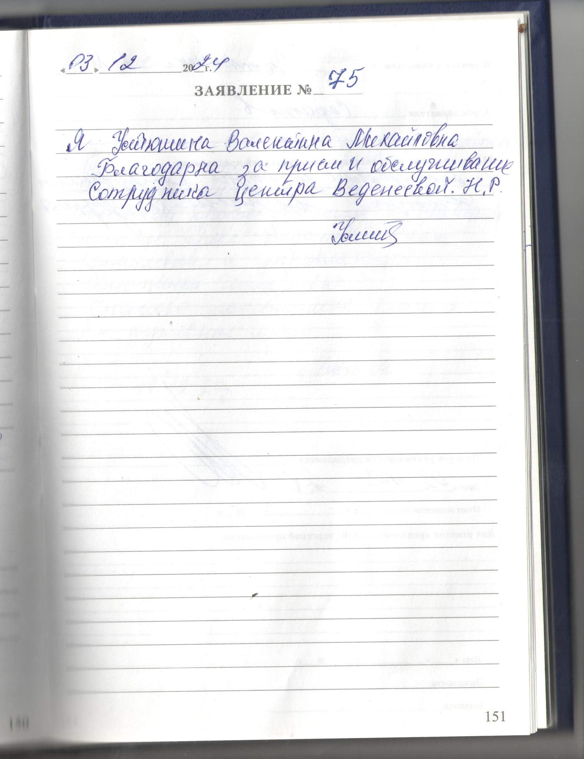 Я, Устюшина Валентина Михайловна, благодарна за прием и обслуживание сотрудника центра Виденеевой Н.Р.