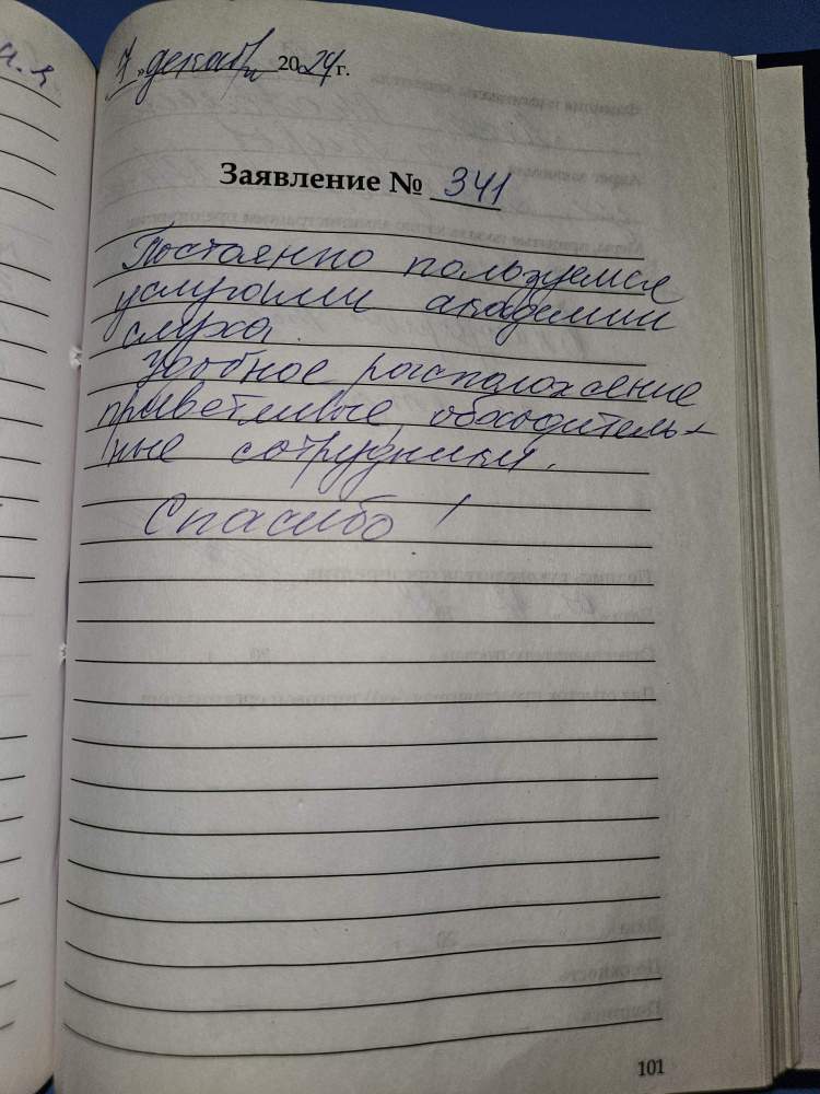 Постоянно пользуемся услугами академии слуха. Удобное расположение приветливые обходительные сотрудники. Спасибо!