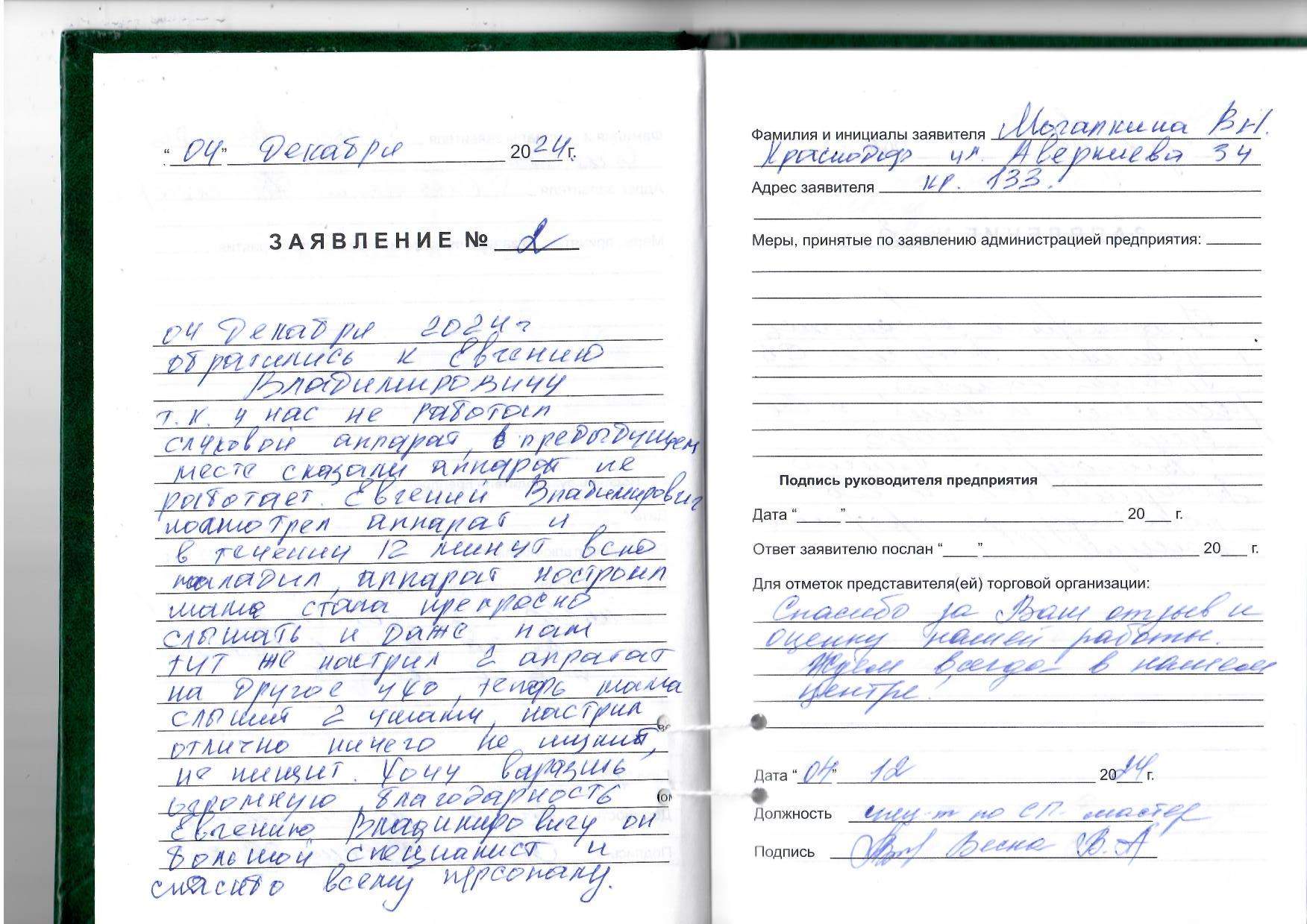 04 декабря 2024 г. обратились к Евгению Владимровичу , т.к у нас не работал слуховой аппарат, в предыдущем месте сказали: аппрарат не работает. Евгений Владимрович посморел аппарат и втечениии 12 минут все наладил, аппарат настроил. Мама стала прекрасно слышать и даже нам тут же настроил второй аппарат на другое ухо. Теперь мам слышит двумя ушами, настроил отлично. Ничего на низких не пищит. Хочу выразить огромную благодарность Евгению владимировичу, он большой специалист и спасибо всему персоналу.