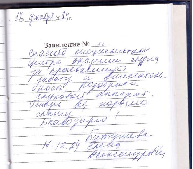 Большое спасибо. Приём у врача прошёл просто великолепно. Всё доступно объяснили, провели диагностику, подобрали аппарат, провели настройку. Персоналу большое спасибо. Аппарат покупали по сертификату. Обращением в ваш центр остались довольны.