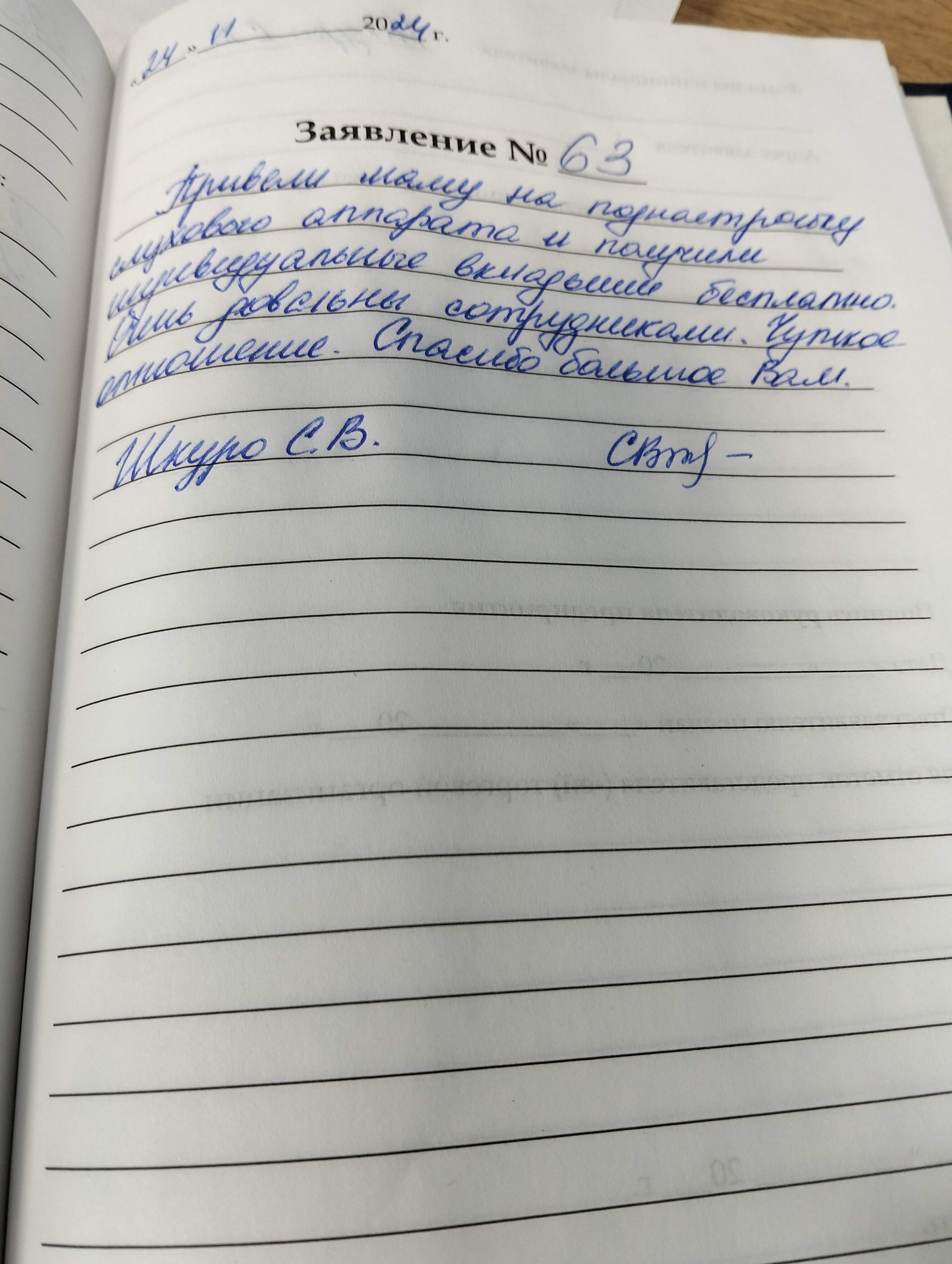 Привели маму на поднастройку слухового аппарата и получили индивидуальные вкладыши бесплатно. Очень довольна сотрудниками. Чуткое отношение.Спасибо большое Вам. Шкуро С.В.