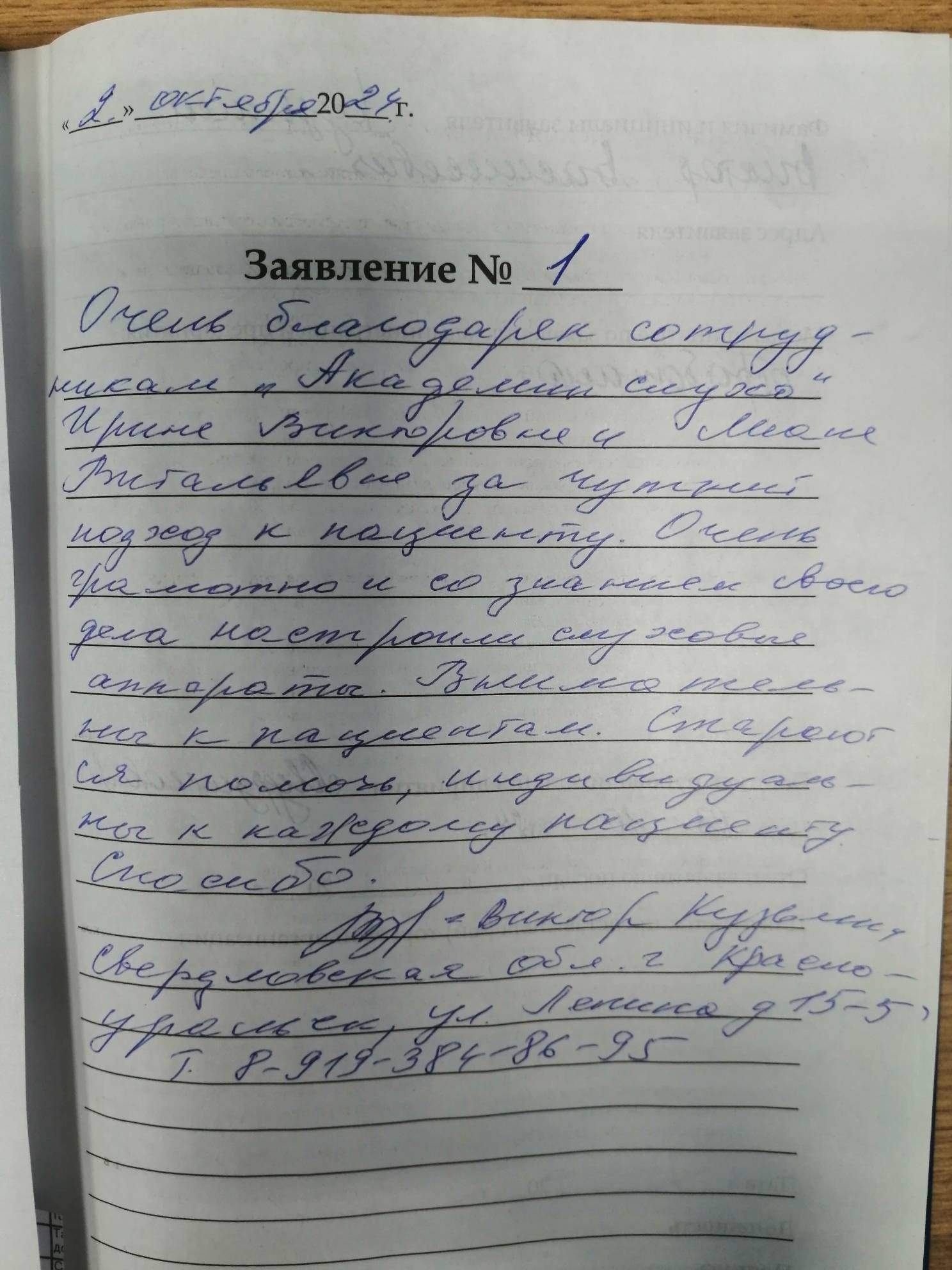 Очень благодарен сотрудникам "Академии слуха" Ирине Викторовне и Лиане Витальевне за чуткий подход к пациенту. Очень грамотно и со знанием своего дела настроили слуховые аппараты. Внимательны к пациентам. Стараются помочь, индивидуальны к каждому пациенту. Спасибо. Виктор Кузьмин. Свердловская область г. Красноуральск, ул. Ленина д15-5, тел 89193848695