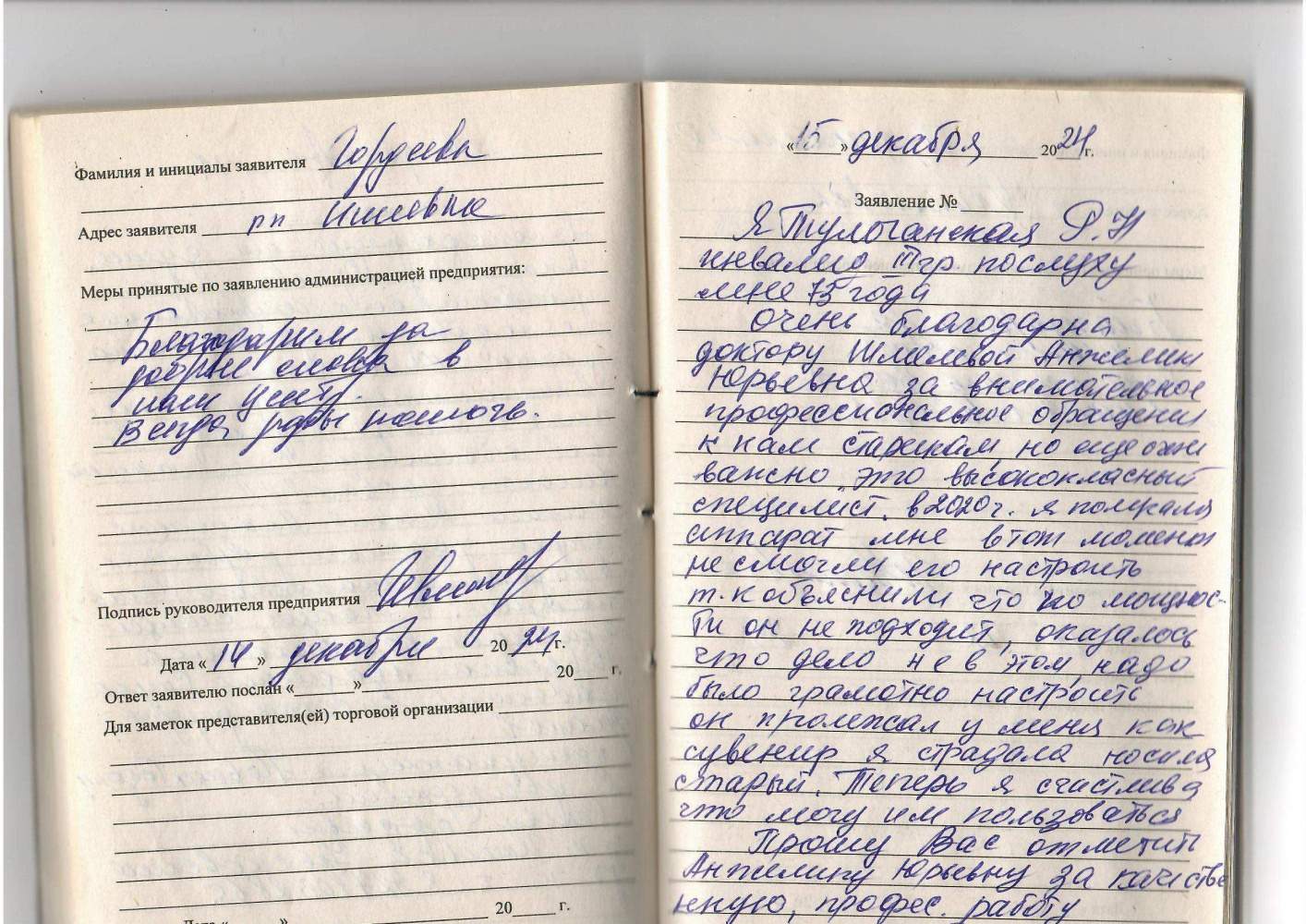 В 2020 году я получала аппарат, мне в тот момент не смогли его настроить, т.к. объяснили, что по мощности он не подходит, оказалось, что дело не в этом, надо было грамотно настроить. Он пролежал у меня как сувенир, я страдала, носила старый. Теперь я счастлива, что могу им пользоваться. Прошу Вас отметить Анжелику Юрьевну за качественную, профессиональную работу. С уважением Р.Н. Тульчанская.