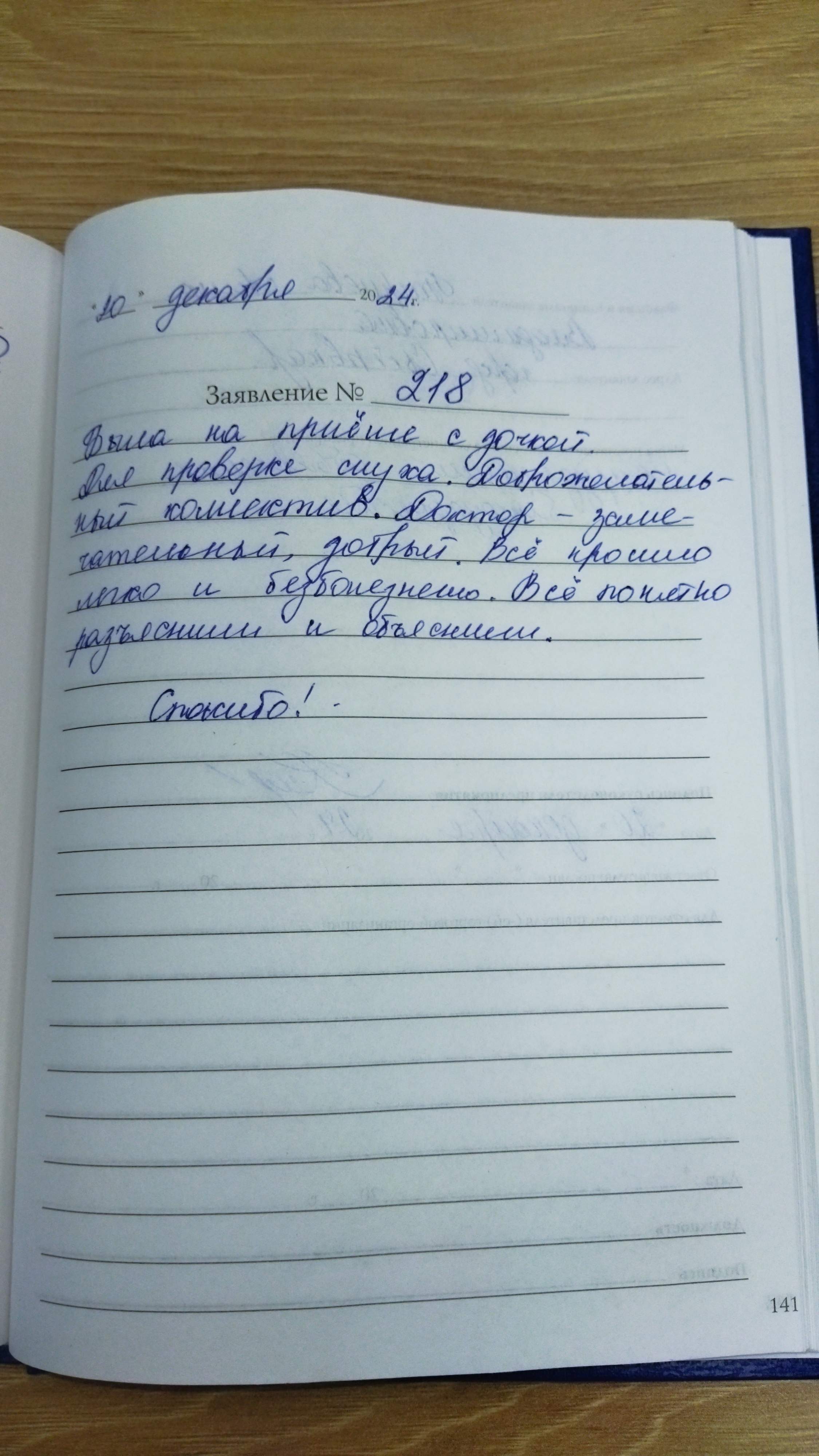 20.12.2024 Была на приеме с дочкой.Для проверки слуха.Доброжелательный коллектив.Доктор - замечательный, добрый. Все прошло легко и безболезненно.Все понятно разъяснили и объяснили. Спасибо!
