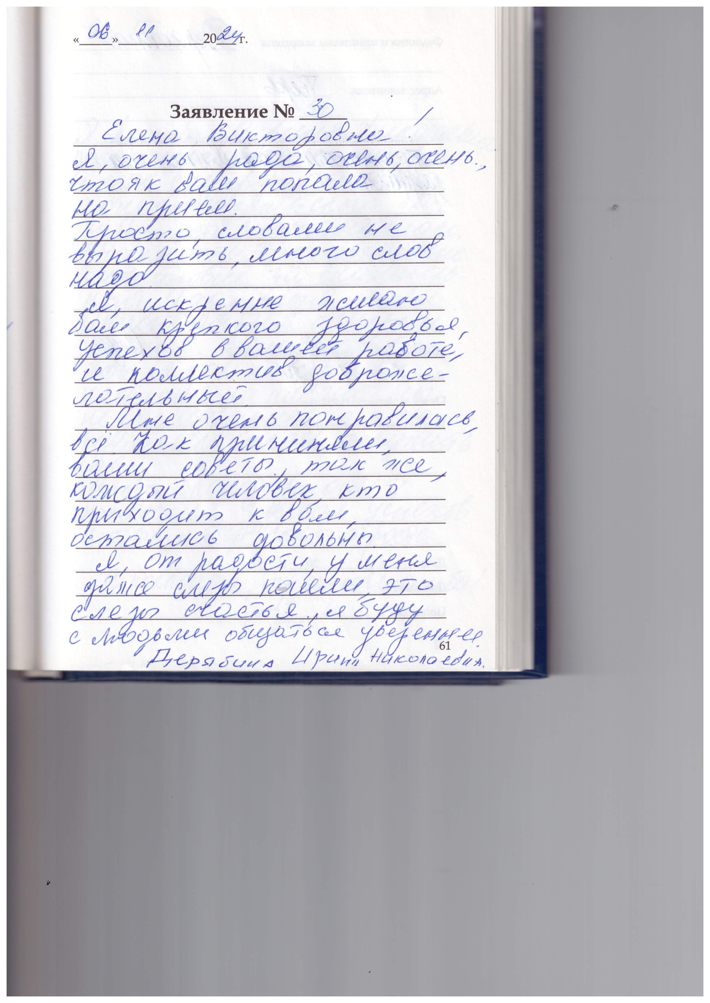 Елена Викторовна! Я, очень рада, очень-очень, что к Вам попала на прием. Просто словами не выразить, много слов надо. Я, искренне желаю Вам крепкого здоровья, успехов в вашей работе, и коллектив доброжелательный. Мне очень понравилось, всё. Как приняли, ваши советы, так же каждый человек, кто приходит к вам, остались довольны. Я, от радости, у меня даже слезы пошли, это слезы счастья, я буду с людьми общаться увереннее.