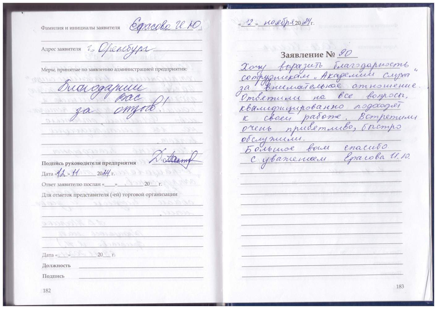 Я, Леонова Марина Николаевна посетила «Академию слуха» вместе с супругом и хочу выразить слова благодарности специалистам, в частности Васильевой Елене Викторовне за внимательный, радостный прием, коллективное обслуживание. Елена Викторовна пошла нам на встречу и несмотря на то, что мы не записывались, она любезно согласилась обслужить нас. Слова благодарности и пожелания здоровья, успехов, любви и творческого роста. С поклоном, огромное спасибо!