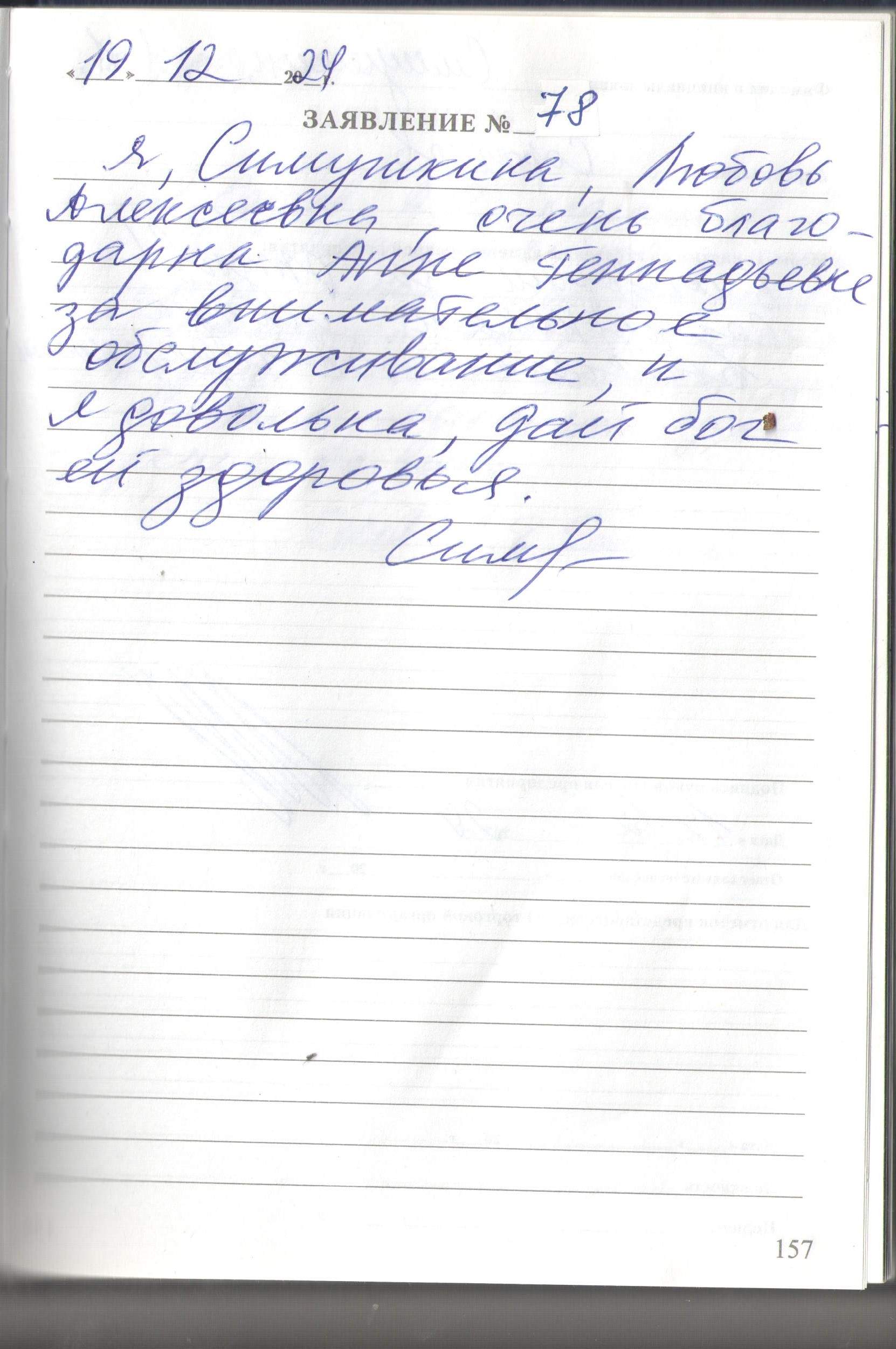 Я, Симушкина Любовь Алексеевна, очень благодарна Анне Геннадьевне за внимательное обслуживание и я довольна. Дай бог ей здоровья