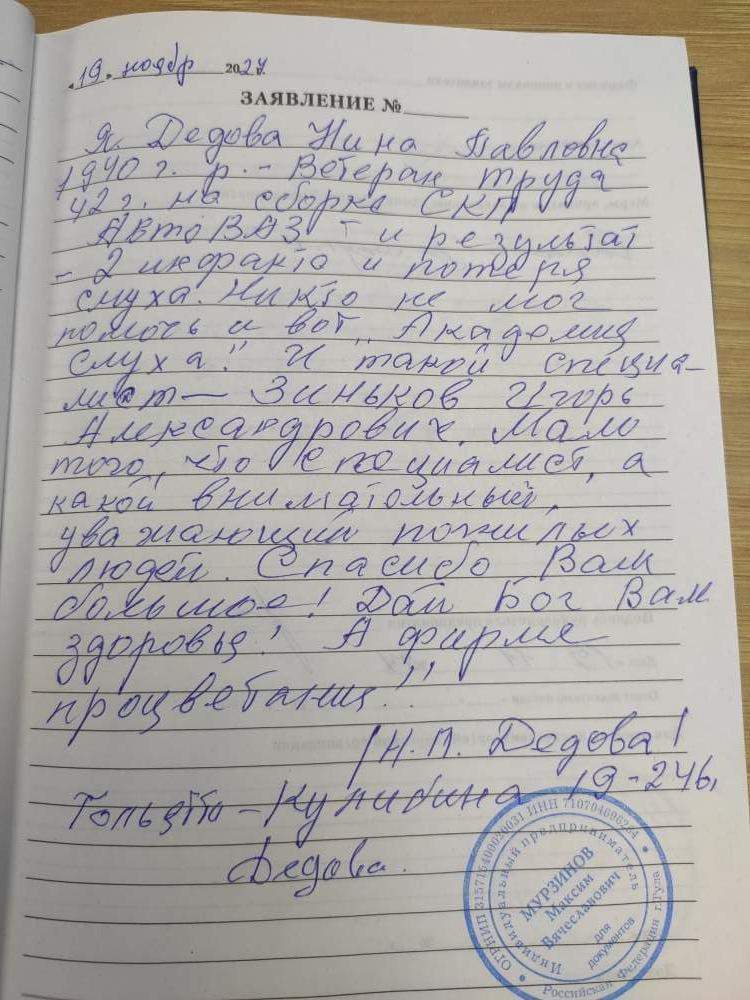 Я Дедова Нина Павловна 1940г.р. Ветеран труда. 42 года на сборке СКП АвтоВАЗ и результат-2 инфаркта и потеря слуха. Ни кто не мог помочь, и вот "Академия Слуха". И такой специалист-Зиньков Игорь Александрович. Мало того что специалист, а какой внимательный, уважающий пожилых людей. Спасибо Вам большое. Дай Бог Вам здоровья, а фирме процветания. Н.П.Дедова
