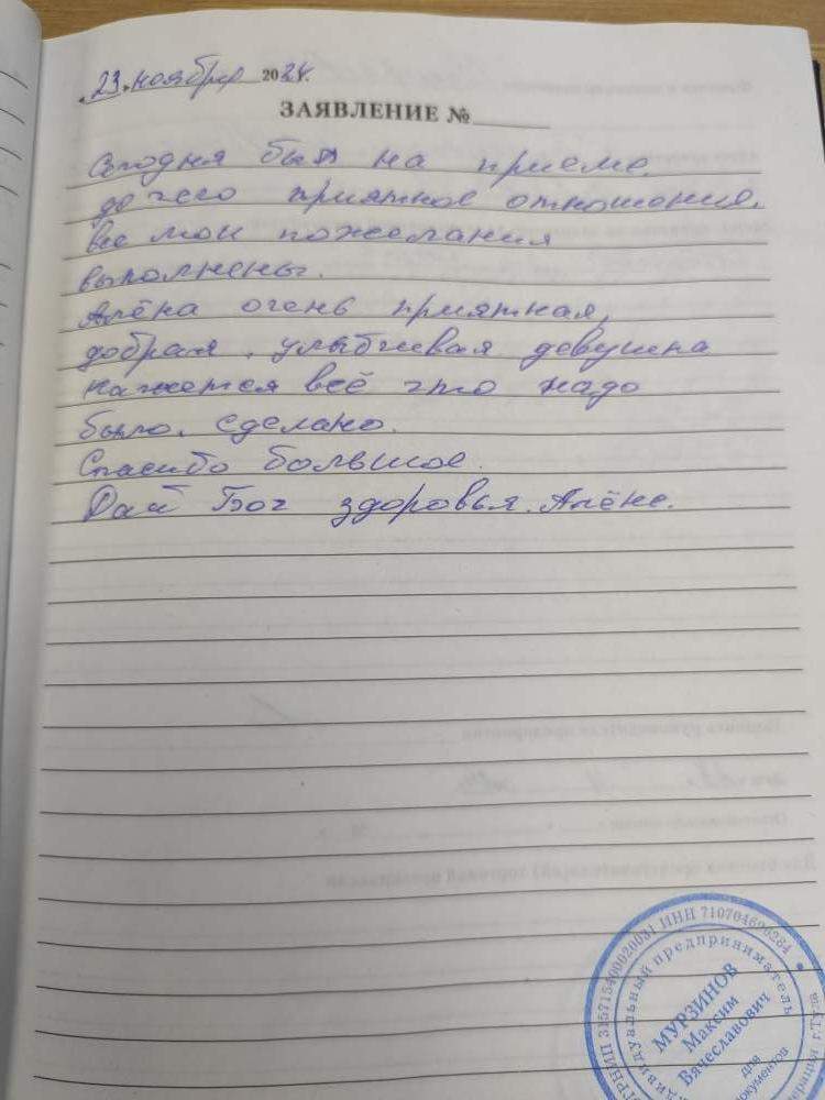 Сегодня был на приеме. До чего приятное отношение. Все мои пожелания выполнены. Алена очень приятная, добрая, улыбчивая девушка. Кажется все что надо было сделано. Спасибо большое. Дай Бог вам здоровья. Алене.