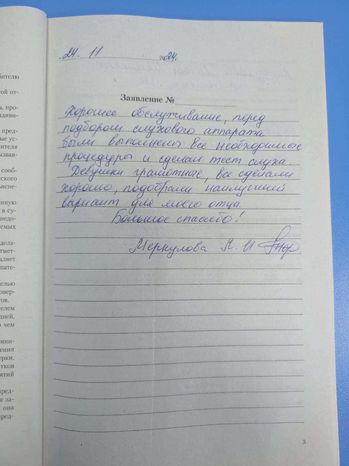 Хорошее обслуживание, перед подбором слухового аппарата были выполнены все необходимые процедуры и сделан тест слуха. Девушки грамотные, все сделали хорошо, подобрали наилучший вариант для моего отца.