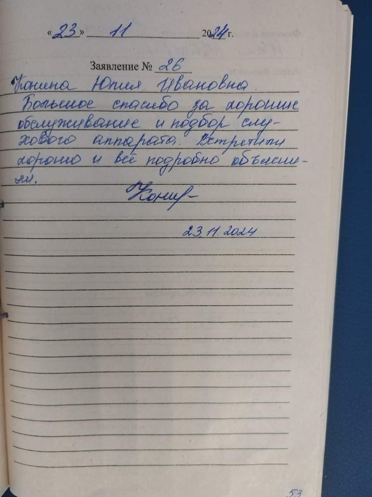 Большое спасибо за хорошее обслуживание и подбор слухового аппарата. Встретили хорошо и все подробно объяснили.