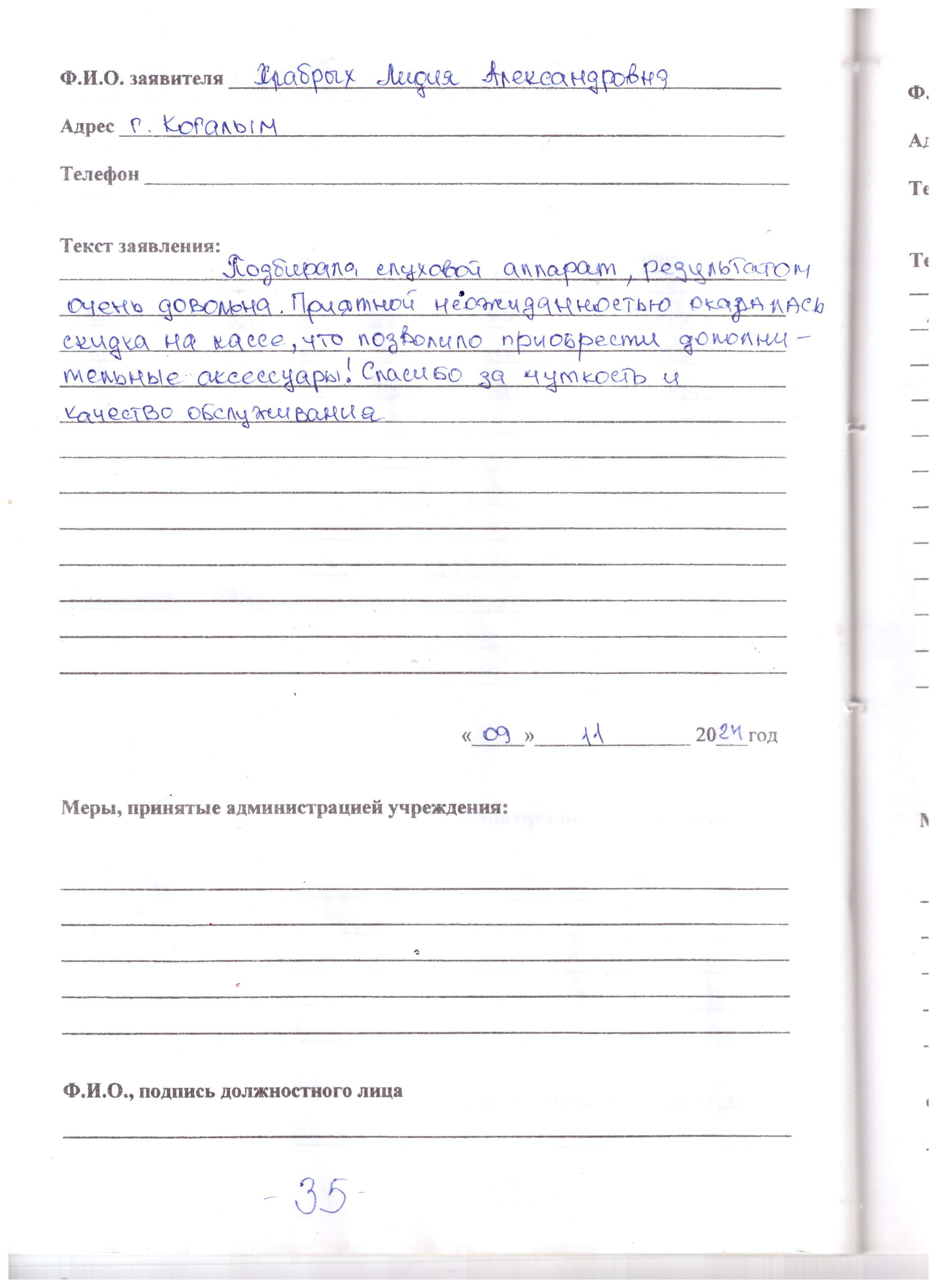 Добрый день! Хочу выразить большую благодарность сотрудникам Академии Слуха. За отличную консультацию, отличное обслуживание. Всем буду вас рекомендовать. Успехов, процветания, удачи!