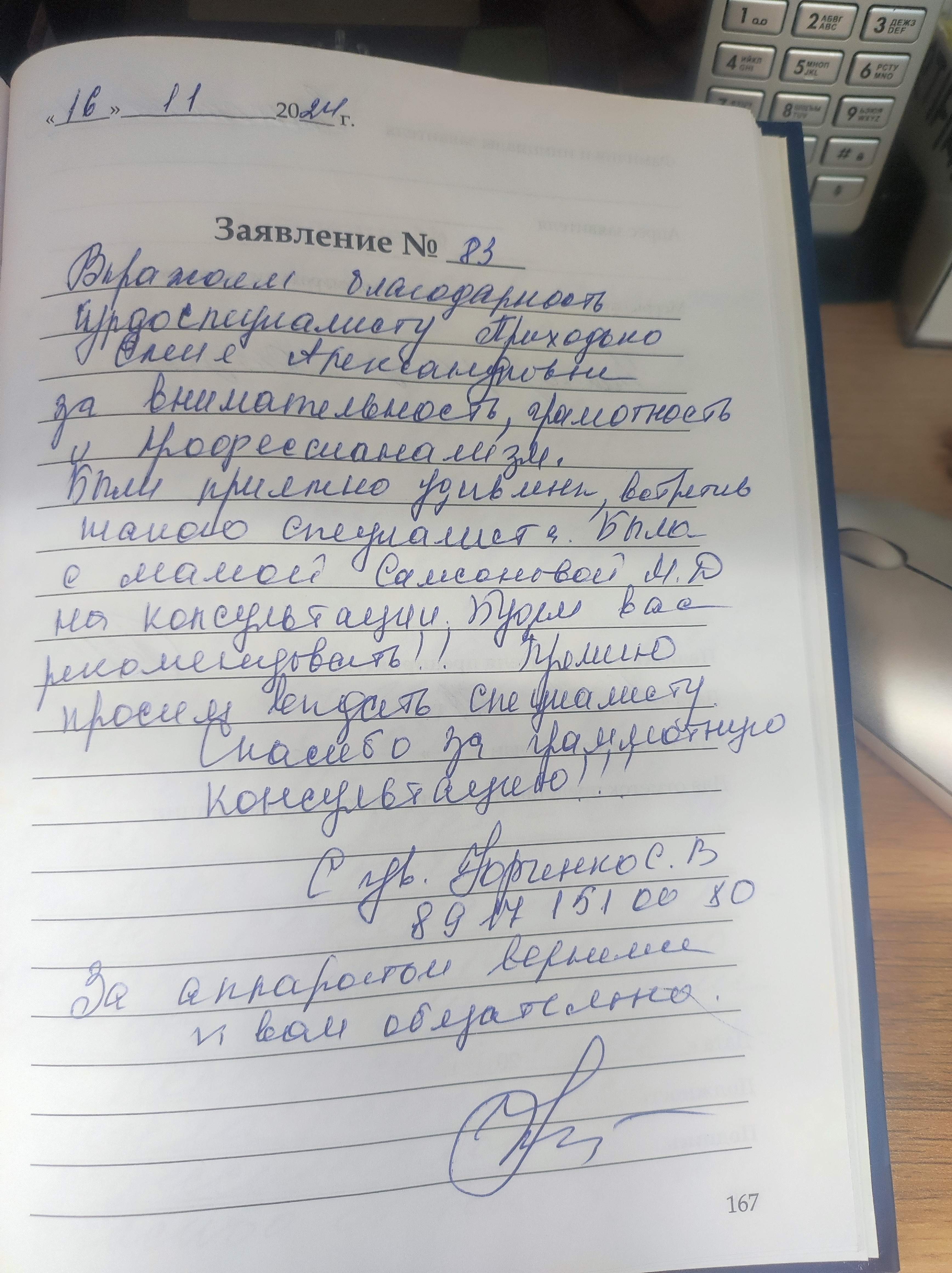 Были приятно удивлены,встретив такого специалиста.Была с мамой Самсоновой М.Д. на консультации.Будем Вас рекомендовать!! Премию просим выдать специалисту.