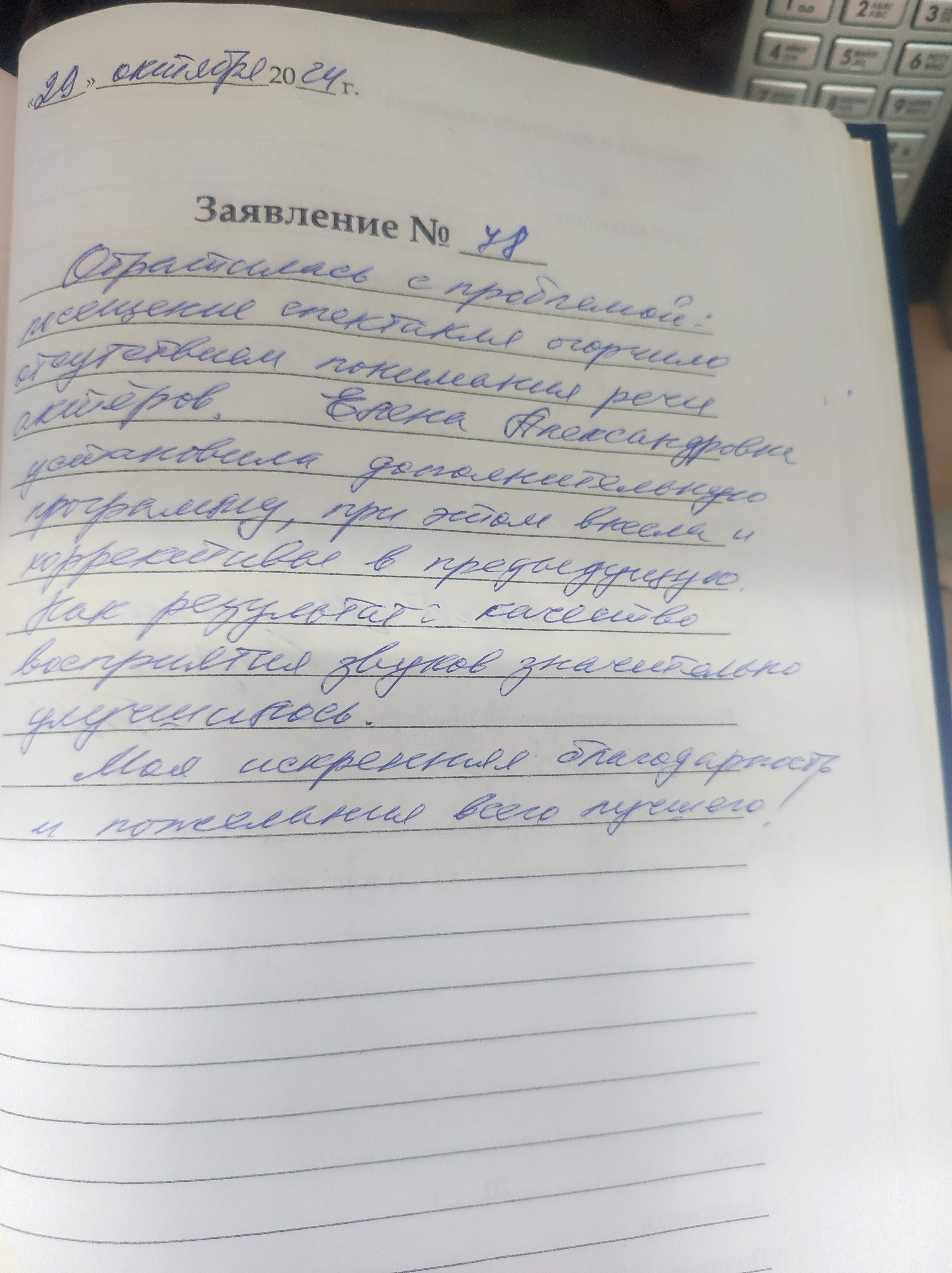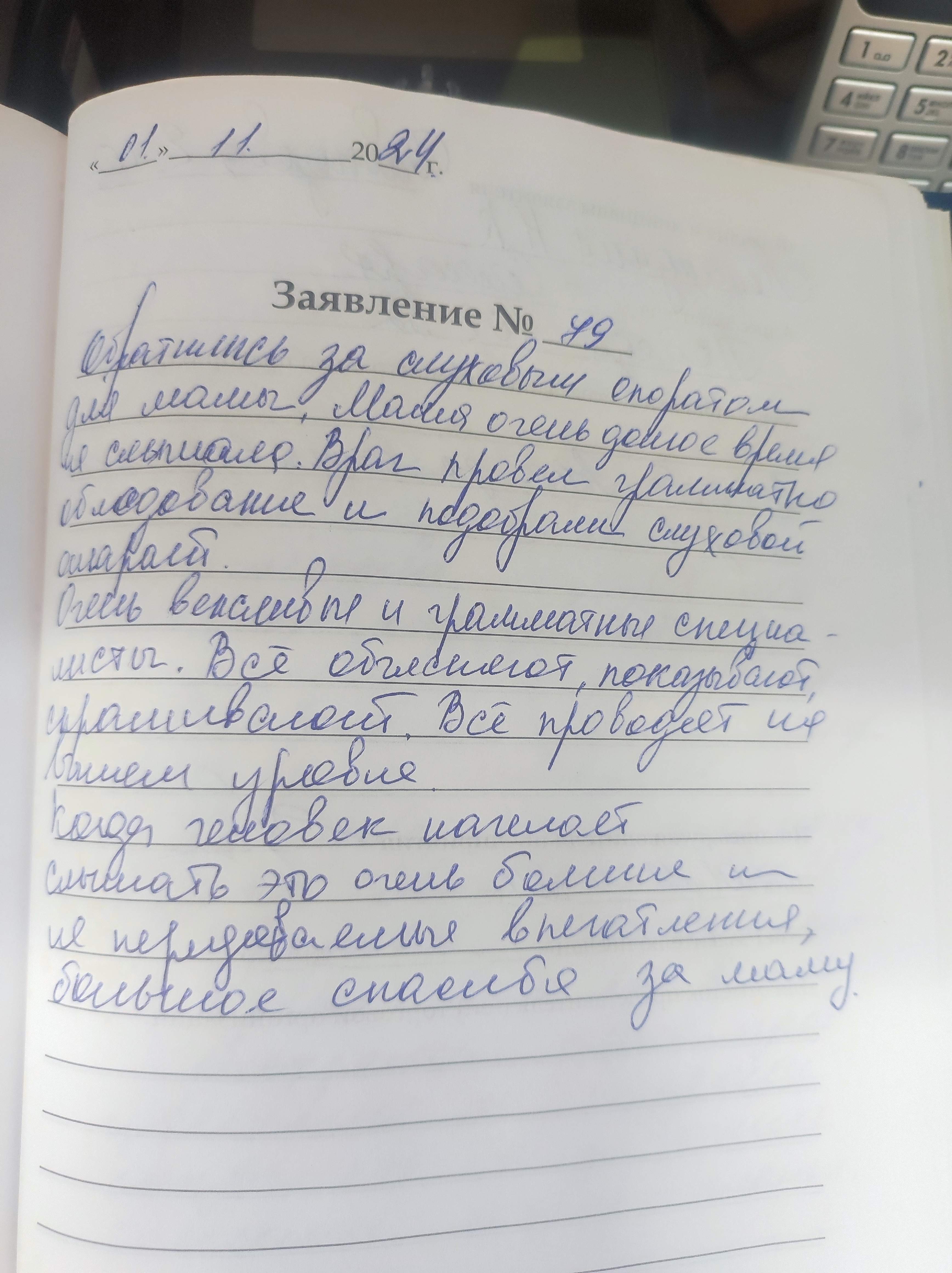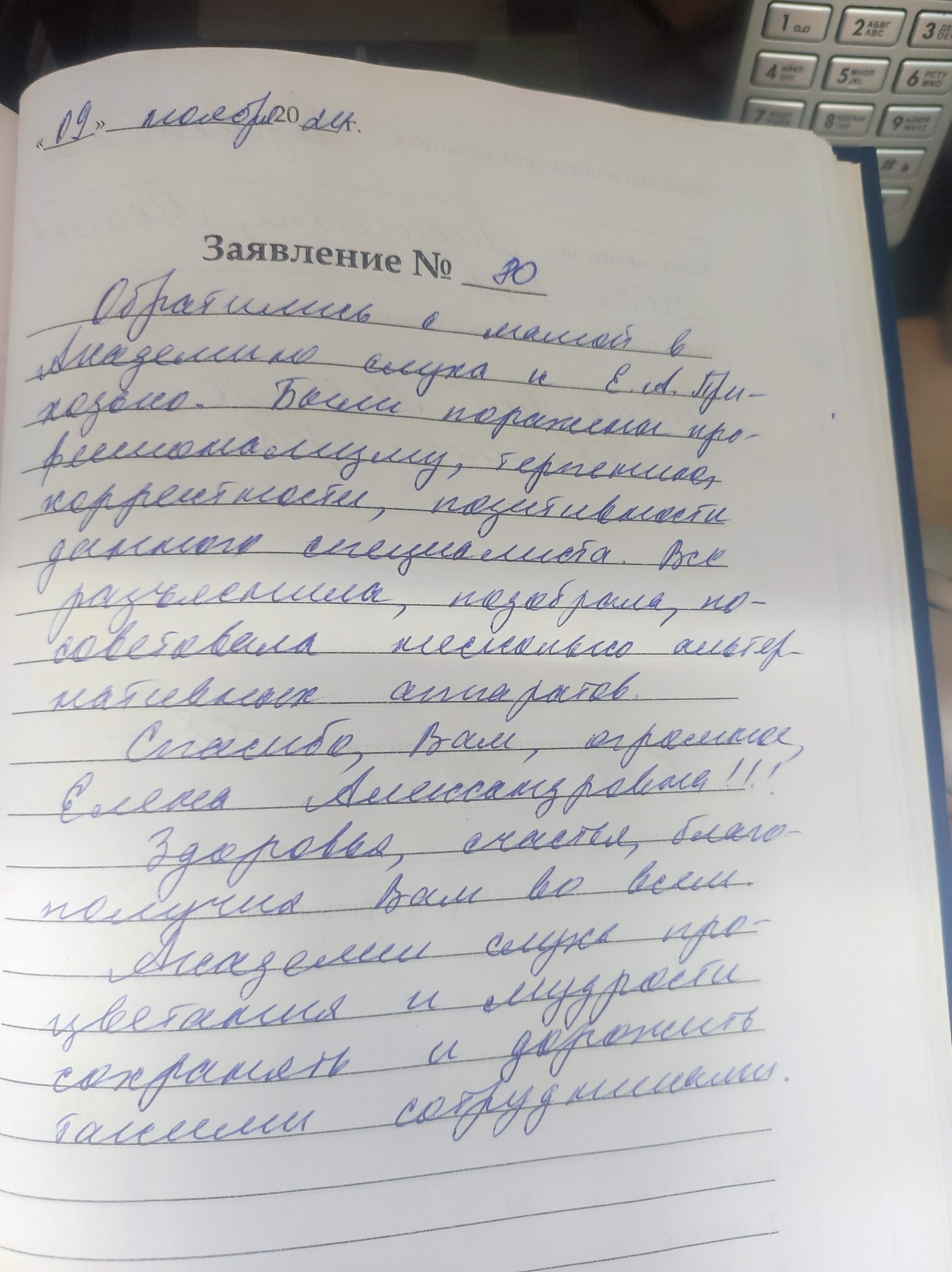 Огромное спасибо за приём, консультацию, проделанные процедуры по проверке слуха, и очень благодарны за внимание по всем вопросам, которые у нас возникли. Спасибо ещё раз всему коллективу академии. За такое внимание, обходительность.