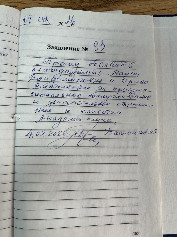 Прошу объявить благодарность Марии Владимировне и Ирине Витальевне за профессиональное обслуживание и уважительное отношение к клиентам Академии слуха. Башманов М.Г
