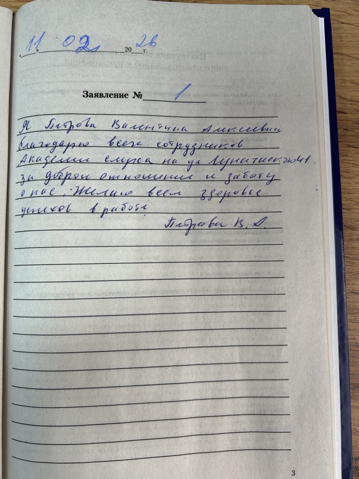 Я, Петрова Валентина Алексеевна благодарю всех сотрудников Академии слуха на ул. Луначарского 41 за доброе отношение и заботу о нас. Желаю всем здоровья, успехов в работе. Петрова В.А