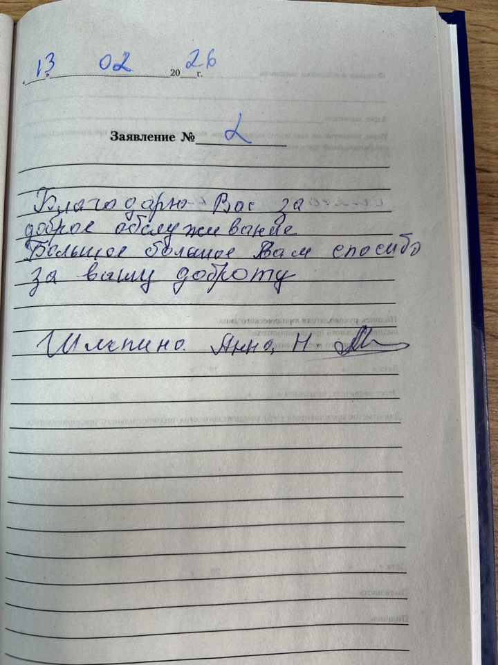 Благодарю Вас за доброе обслуживание. Большое спасибо Вам, спасибо за вашу доброту. Шлепина А.Н