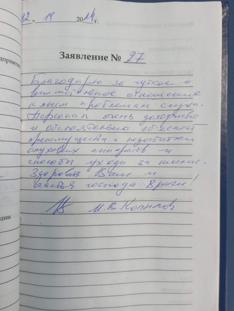 Я, Кошелев Н.В посетил Академию слуха. Приобрёл слуховой аппарат, все понравилось в обслуживании. Большое спасибо.