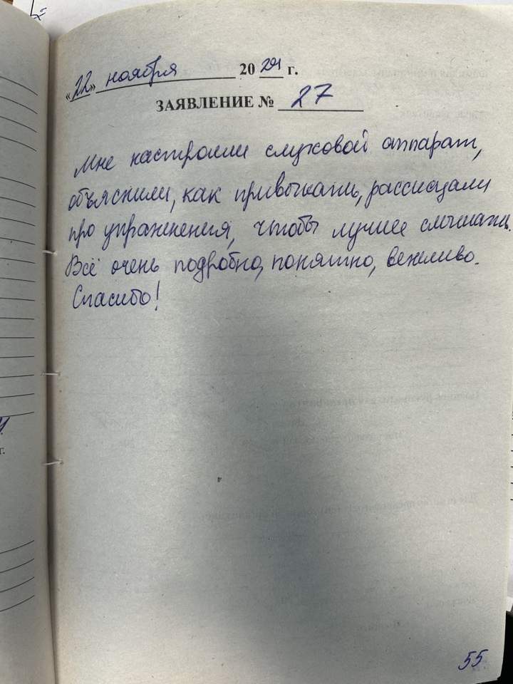 Мне настроили слуховой аппарат, объяснили, как привыкать, рассказали про упражнения, чтобы лучше слышать. Все очень подробно, понятно, вежливо. Спасибо!