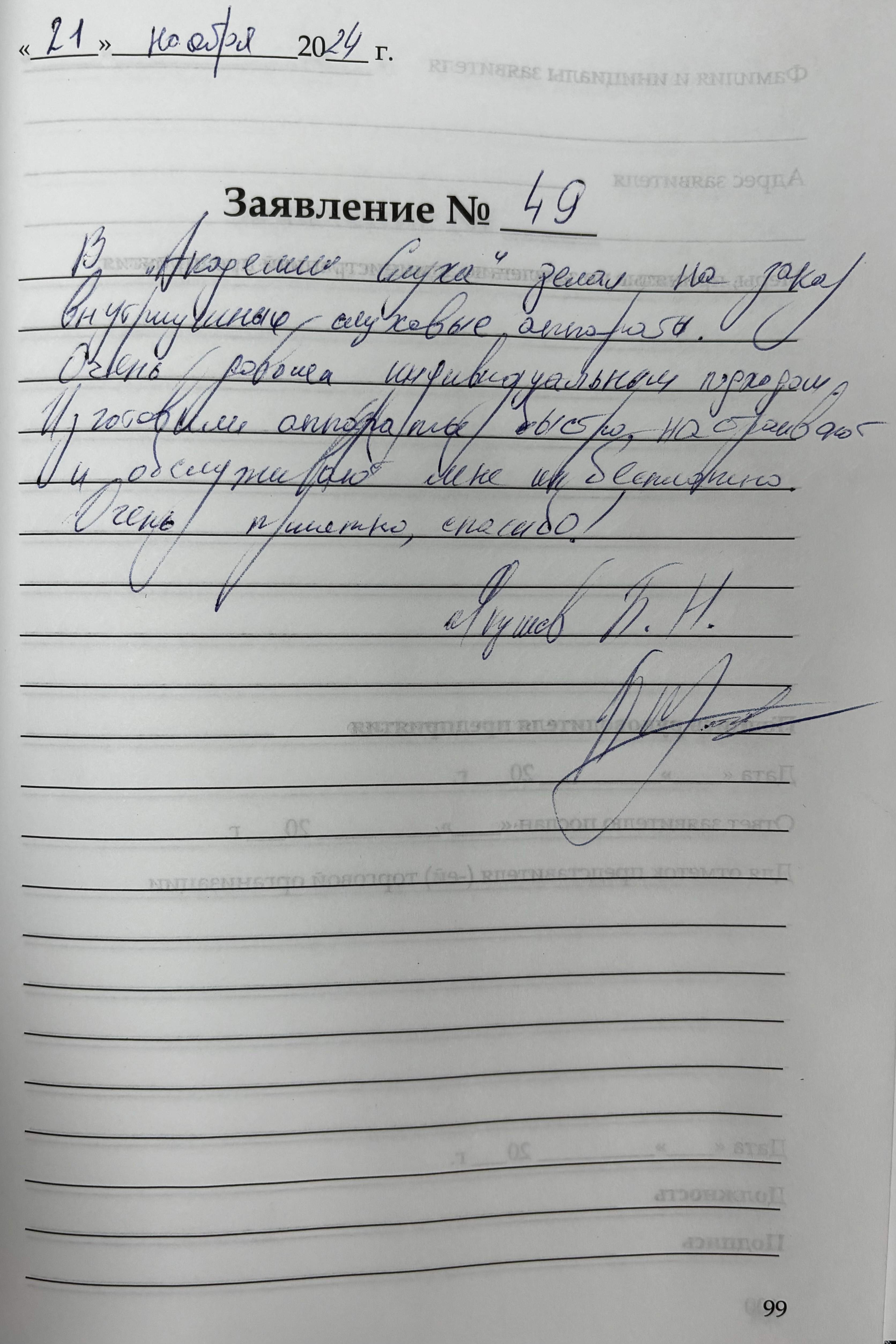 В «Академии Слуха» делал на заказ внутриушные слуховые аппараты. Очень доволен индивидуальным подходом. Изготовили аппараты быстро, настраивают и обслуживают мне их бесплатно. Очень приятно, спасибо!