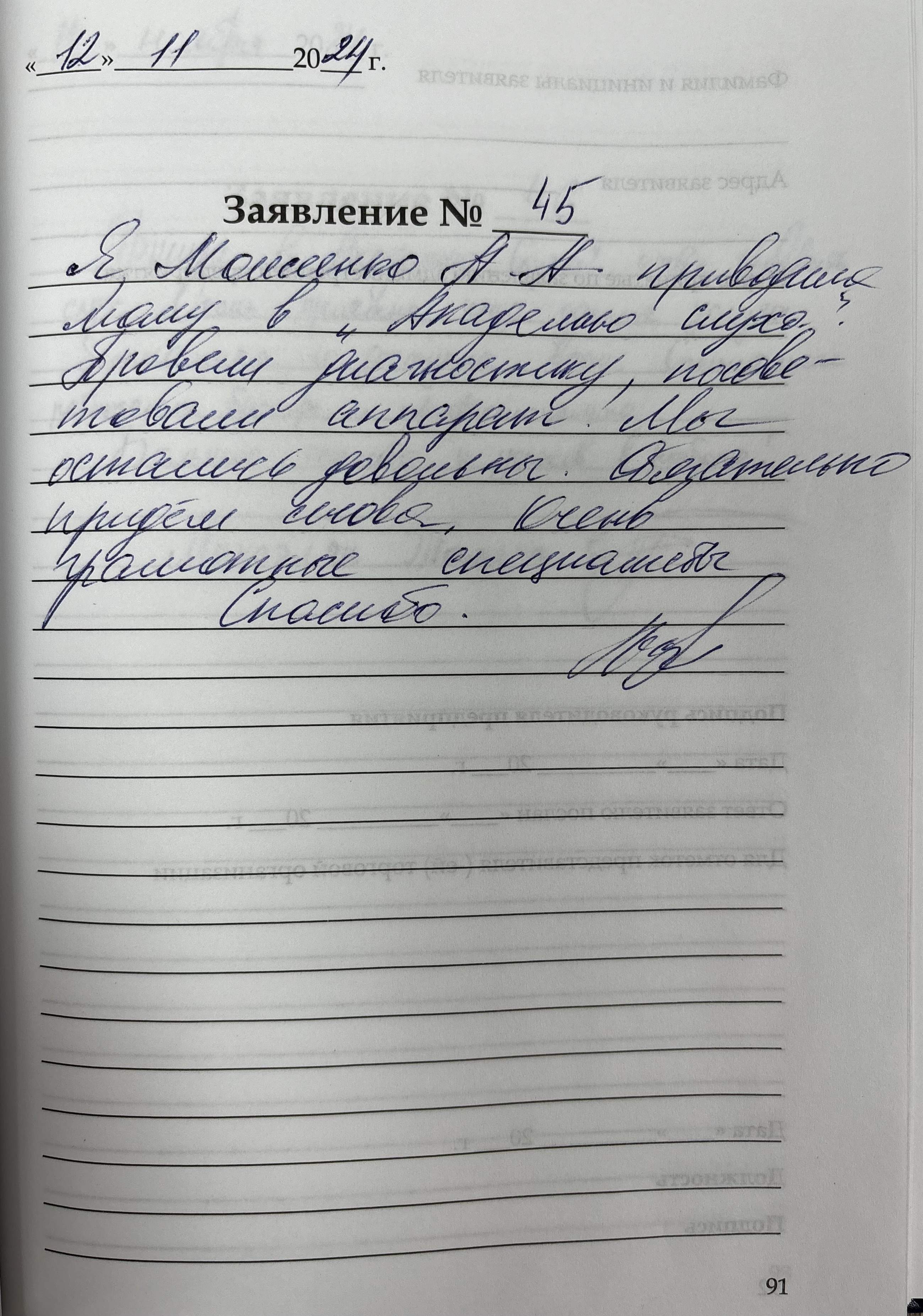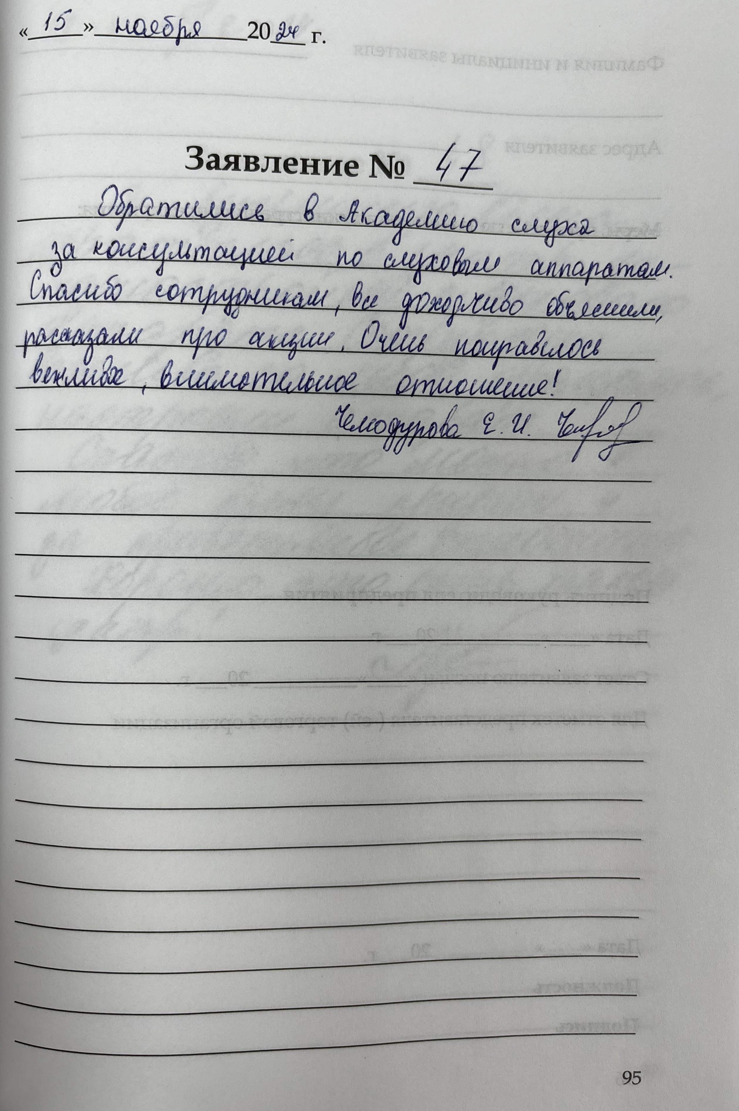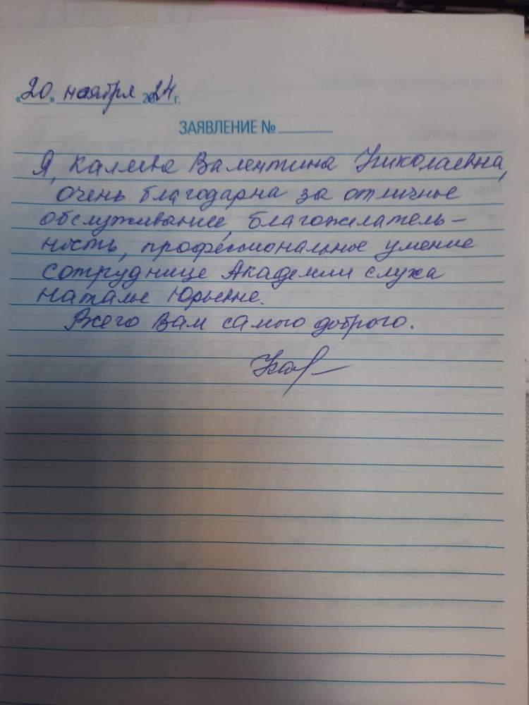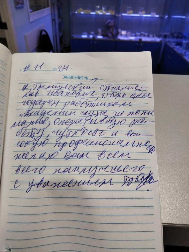 Я, Каляева Валентина Николаевна, очень благодарна за отличное обслуживание, благожелательность, профессиональное умение сотруднице Академии слуха Наталье Юрьевне. Всего Вам самого доброго.