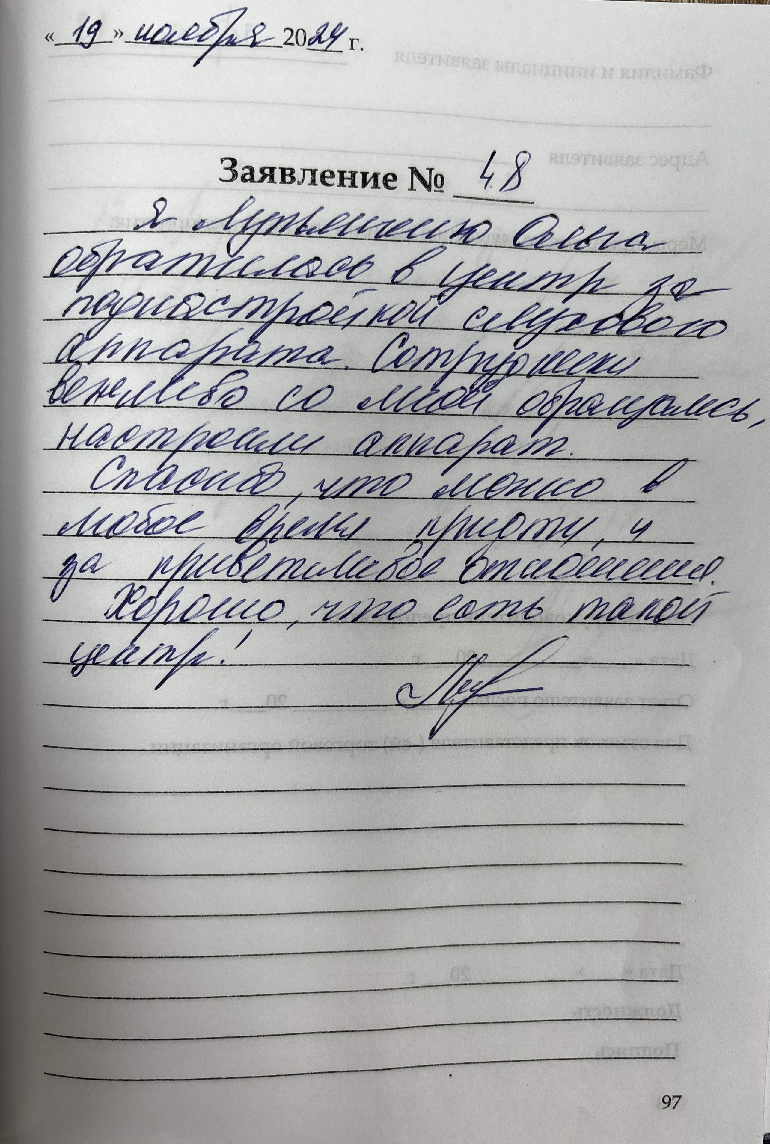 Я, Лукьянченко Ольга, обратилась в центр за поднастройкой слухового аппарата. Сотрудники вежливо со мной обращались, настроили аппарат. Спасибо, что можно в любое время прийти, и за приветливое отношение. Хорошо, что есть такой центр!