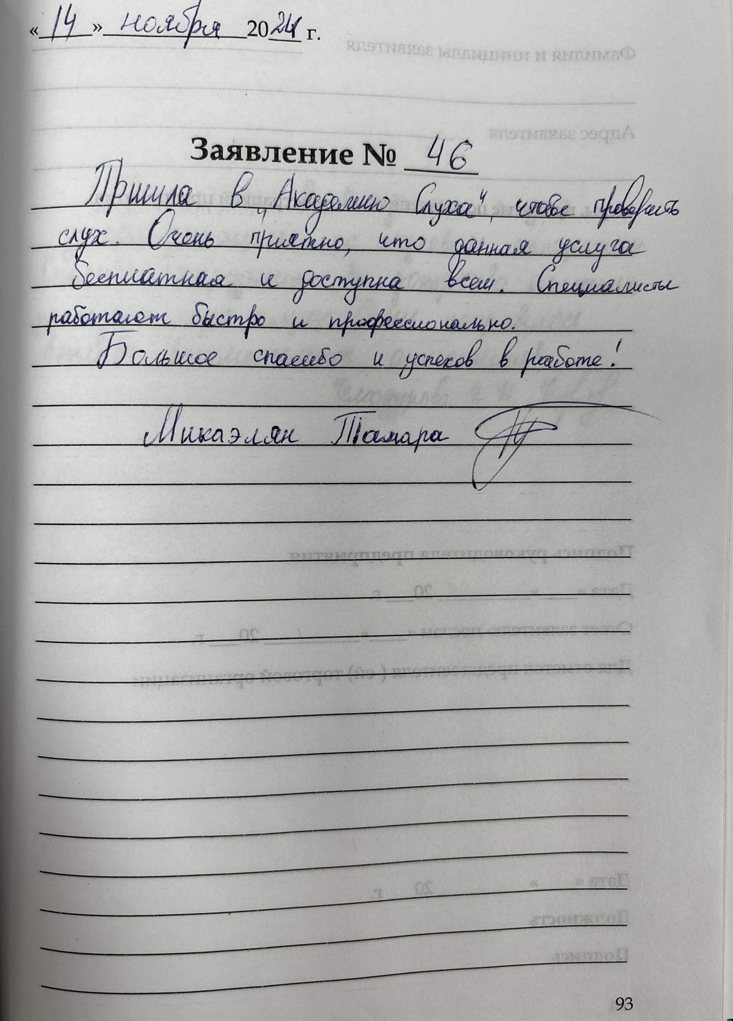 Пришла в «Академию Слуха», чтобы проверить слух. Очень приятно, что данная услуга бесплатная и доступна всем. Специалисты работают быстро и профессионально. Большое спасибо и успехов в работе!