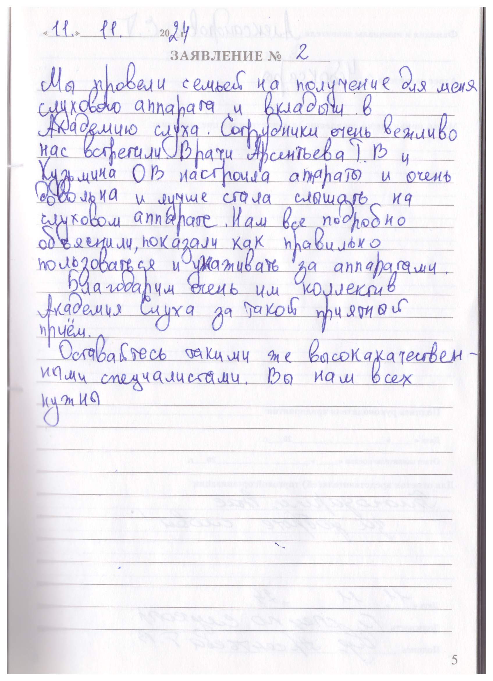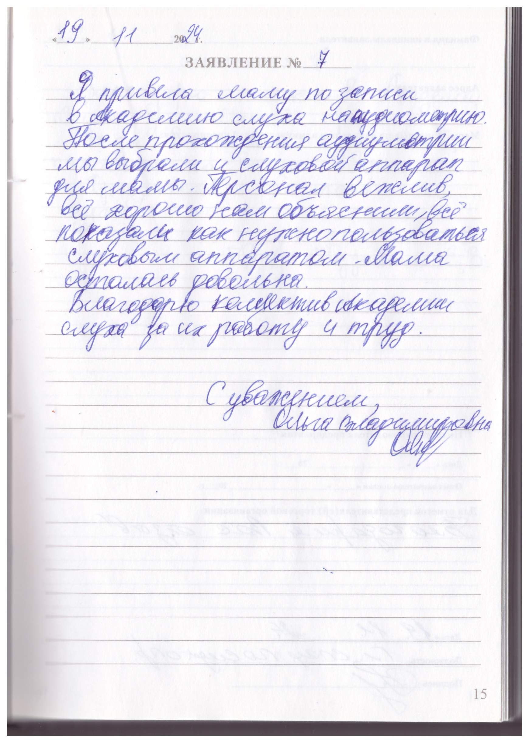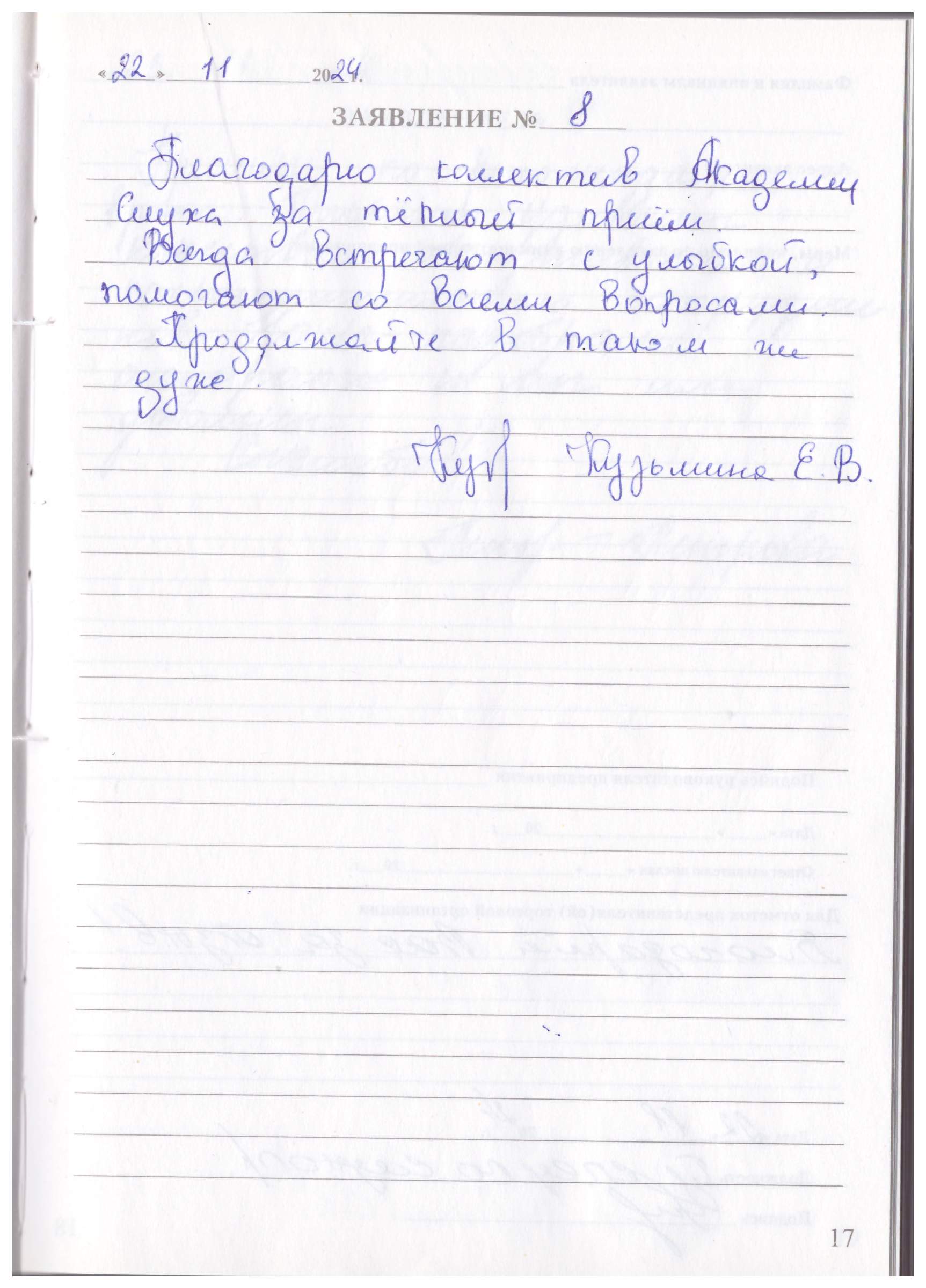 Мы провели с семьей на получение для меня слухового аппарата и вкладыш в академию слуха. Сотрудники очень вежливо нас встретили. Врачи Арсентьева Т.В. и Кузьмина О.В. настроила аппараты и очень довольна и лучше стала слышать на слуховом аппарате. Нам все подробно объяснили, показали как правильно пользоваться и ухаживать за аппаратами.