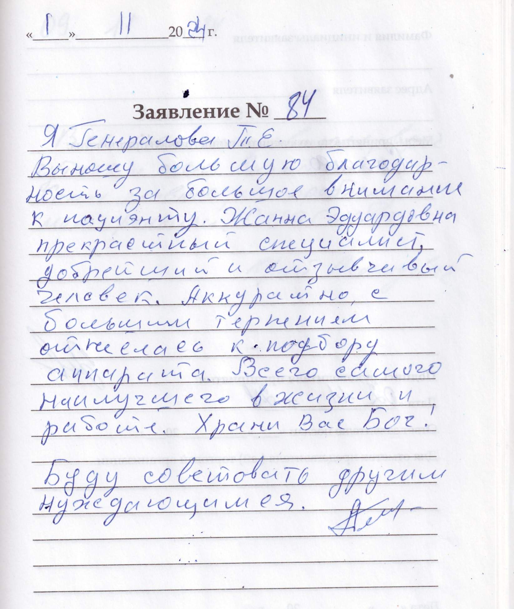 Я, Генералова Т.Е. выношу большую благодарность за большое внимание к пациенту.Жанна Эдуардовна прекрасный специалист добрейшей и отзывчивый человек.Аккуратно, с большим терпением отнеслась к подбору аппарата.Всего самого наилучшего в жизни и в работе.Храни Вас Бог!Буду советовать другим нуждающимся.