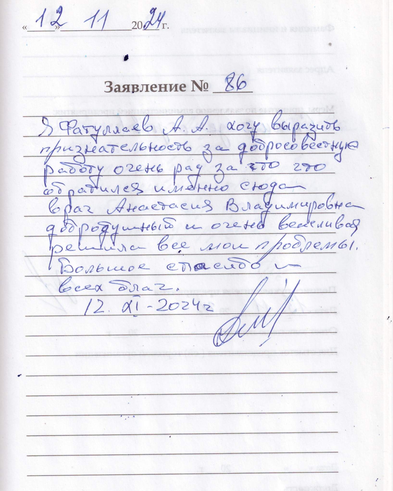 Я, Фатуллаев А.А. хочу выразить признательность за добросовестную работу, очень рад за то,что обратился именно сюда.Врач Анастасия Владимировна добродушный и очень вежливая,решила все мои проблемы.Большое спасибо и всех благ