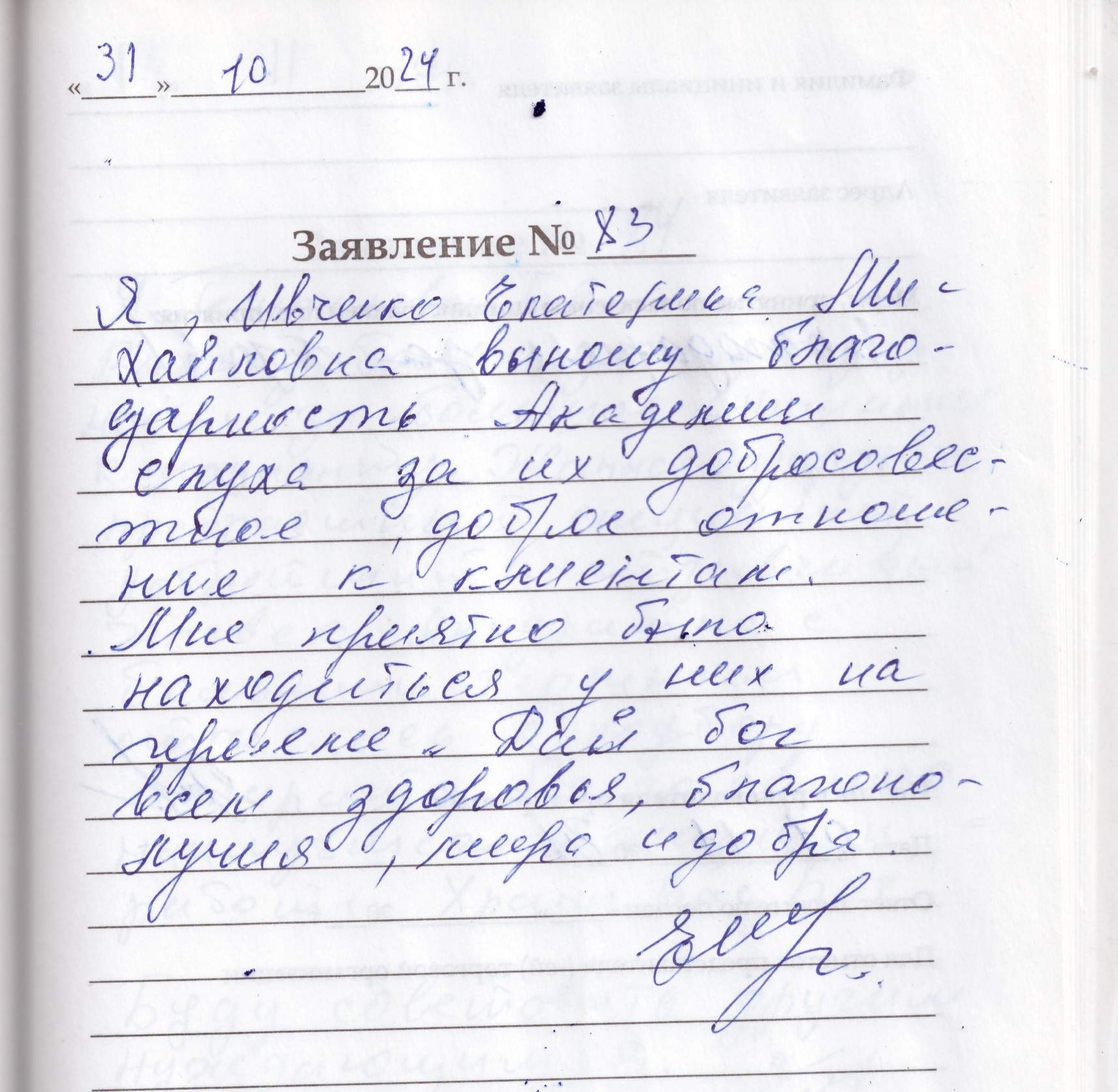 Я, Ивченко Екатерина Михайловна выношу благодарность "Академия Слуха" за их добросовестное отношение к клиентам.Мне приятно было находиться у них на приеме"Дай бог всем здоровья,благополучия,мира и добра.