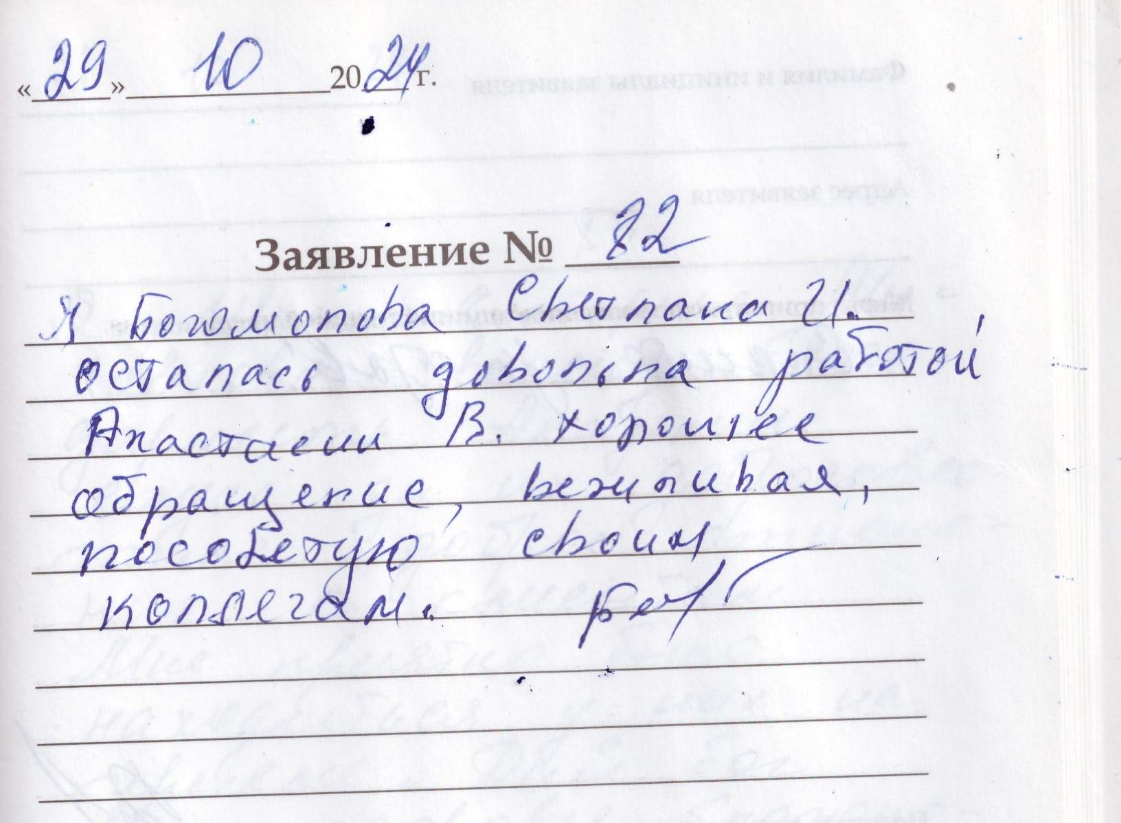 Я,Богомолова Светлана И.,осталось довольна работой Анастасии В.,хорошее обращение ,вежливая,посоветую своим коллегам.
